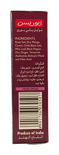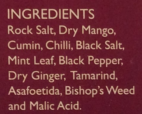 Rock salt dry mango cumin chilli black salt mint leaf black pepper dry ginger tamarind asafoetida bishop's weed & malic acid.