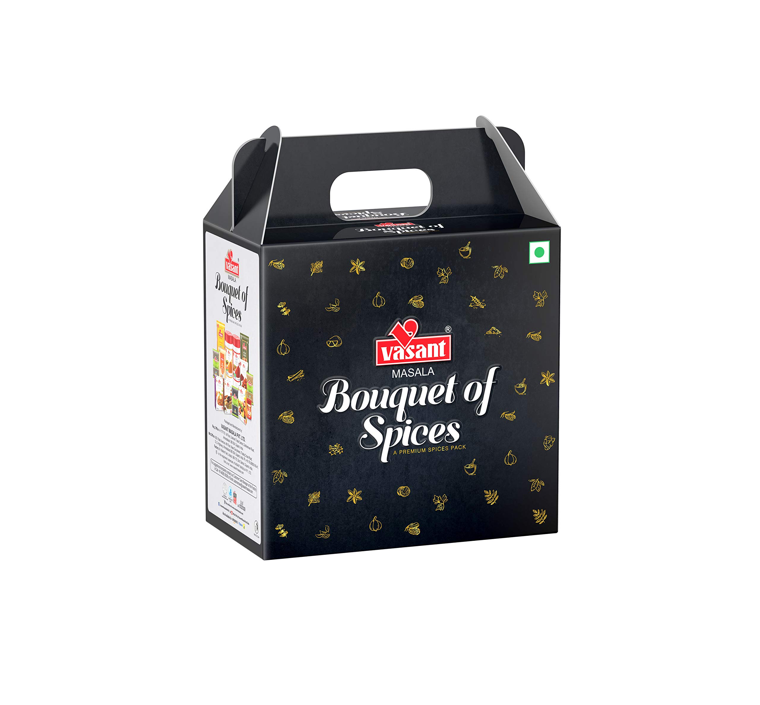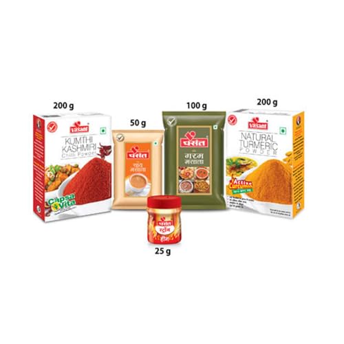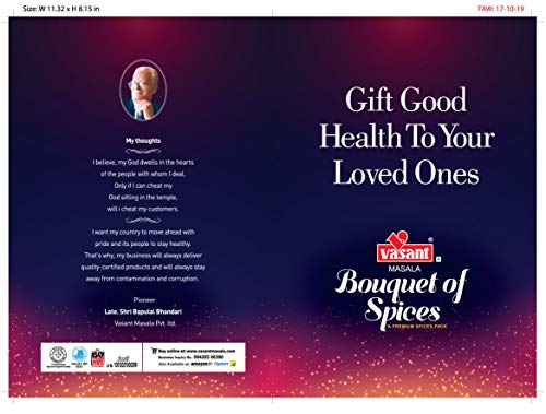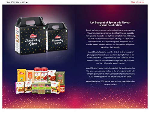 Let Bouquet of spices add flavor to your celebration People are becoming more and more health conscious nowadays. They are increasingly concerned about health issue caused by having sweets chocolates and dry fruits during festivities. Additionally the shelf life of conventional sweets is hardly 2 or 3 days while chocolates last for 10-15 days but only when refrigerated. Additionally sweets lose their softness and flavor when refrigerated even if they don't go stale. Vasant Masala come up with first of its kind concept of gifting a pack of spices to your loved ones during festivals or any kind of celebration. Our spices typically have a shelf life of 8-10 months. A family of four can use the 500 gm pack for 20-25 days and the 1 kg pack for about 2 months. Vasant Masala improve health through their therapeutic properties. Our spices are processed in state of the art hygienic facility with stringent quality control where Controlled Temperature Grinding ( CTG ) technology retains the natural flavor of the spices. Vasant Masala has 100% natural and uses no artificial color of preservatives. It is an ideal gifting option for corporate gifting and other gifting occasions such as Diwali Raksha Bandhan Birthdays Anniversaries & house-warming. Package Include : Vasant Kumthi Kashmiri Chilli Powder 200g Vasant Halder Powder 200g Vasant Tea Masala 50g Vasant Strong Hing 25g Vasant Garam Masala 100g.