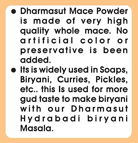 The mace powder is also known as ground mace its a brown-coloured powder. It has a spicy flavor but it's milder and more delicate than nutmeg. Organic Mace powder is used to treat diarrhea nausea vomiting stomach spasms pain and intestinal gas. Additionally it is used to treat cancer and kidney disease. This javantri powder is used in all kinds of baked goods including donuts cakes puddings custard and sweet potatoes. In addition to enhancing the flavor of your food mace powder is perfect and beneficial for your health. Dharmasut mace powder contains 100% pure and natural ingredients that bring you great health benefits and a delicious taste to your food.