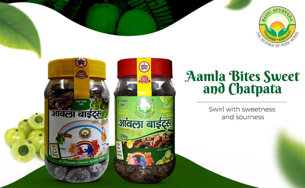 BASIC AYURVEDA Amla Bite Candy Sweet 250g With Chatpata 250g Combo With Jar Pack |
