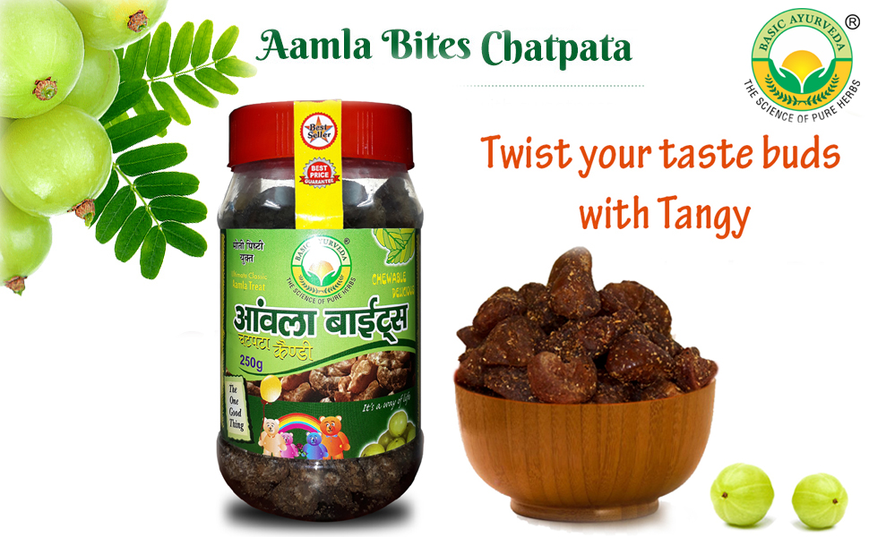 • Basic Ayurveda Aamla Bite Chatpata Candy is an Indian flavour of sour Dried Amla 100% natural with no artificial colouring or flavouring. Now snack smartly right away with our amazing Basic Ayurveda Chatpata Amla Candy! This delight is tangy delicious and