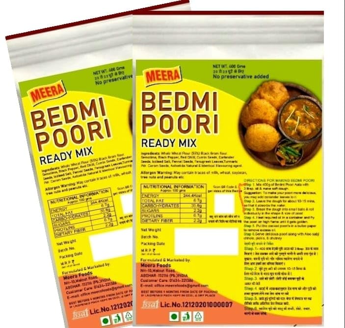 Bedmi Poori is Traditional Masala Poori widely known as Vrindavan Bedai. Bedmi Poori ready mix is prepared with carefully choosen ingredients that creates traditional flavour and next level taste. Bedmi Pooris are enjoyed with Aloo Tamatar Curry. Use of salad & Pickles may add mouth watering also. vedio recipe can be played by scanning QR code given on each pack.