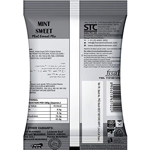 ABOUT THE BRAND: Chandan Mouth Freshener also known as Chandan Mukhwas is a renowned brand offering a delicious mix of sweet salted sweet and sour Mouth Fresheners along with Digestives Appetizers (Pan) & Confectioneries and Sugar. Chandan Mouth Freshener with a huge range of product varieties adds a perfect ending to every meal. ABOUT THE PRODUCT: Mint Sweet Mukhwas (Pack of 2). Size: 200g. An after-meal mouth freshener or mukhwas. 100% vegetarian. Chandan’s Products are made from pure natural and non-toxic ingredients that does not cause any addiction. The colours being used are the extracts from fruits and vegetables and thus are 100% Natural. Ingredients: Fennel seeds added sugar contains nature identical flavour. FSSAI certified.