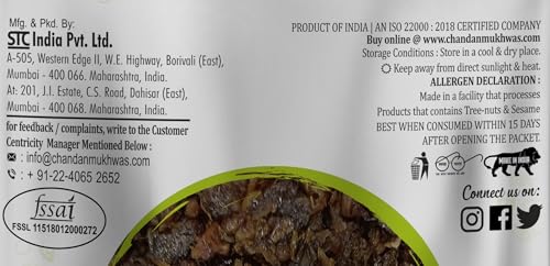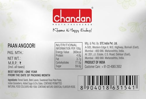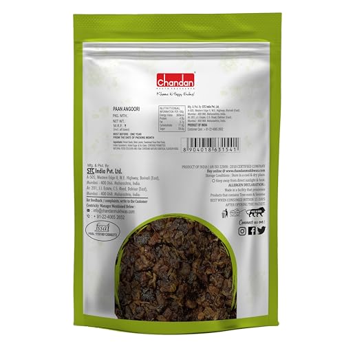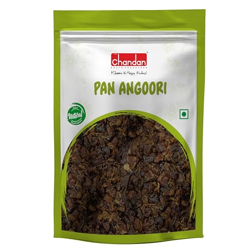 ABOUT THE BRAND: Chandan Mouth Freshener also known as Chandan Mukhwas is a renowned brand offering a delicious mix of sweet salted sweet and sour Mouth Fresheners along with Digestives Appetizers (Pan) & Confectioneries and Sugar. Chandan Mouth Freshener with a huge range of product varieties adds a perfect ending to every meal. ABOUT THE PRODUCT: Pan Angoori. Size: 100g . An after-meal mouth freshener. 100% vegetarian. Chandan’s Products are made from pure natural and non-toxic ingredients that does not cause any addiction. The colours being used are the extracts from fruits and vegetables and thus are 100% Natural. Ingredients: Fennel seeds sugar dry dates betel leaves glazed fruits & sweetened rose petal paste. Contains permitted natural foods colours INS - 150 d contains natural & nature identical flavours. FSSAI certified.