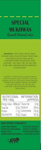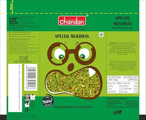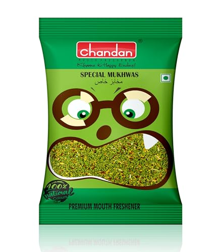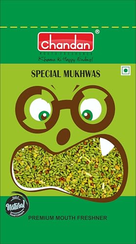 ABOUT THE BRAND: Chandan Mouth Freshener also known as Chandan Mukhwas is a renowned brand offering a delicious mix of sweet salted sweet and sour Mouth Fresheners along with Digestives Appetizers (Pan) & Confectioneries and Sugar. Chandan Mouth Freshener with a huge range of product varieties adds a perfect ending to every meal. ABOUT THE PRODUCT: Special Mukhwas. Size: 200g. An after-meal mouth freshener or mukhwas. 100% vegetarian. Chandan’s Products are made from pure natural and non-toxic ingredients that does not cause any addiction. The colours being used are the extracts from fruits and vegetables and thus are 100% Natural. Ingredients: (Fennel seeds Sesame seeds Coriander seeds Amaranth seeds Added Sugar) 97% desiccated coconut 3% Spiced Extract & Spinach extract. FSSAI certified.