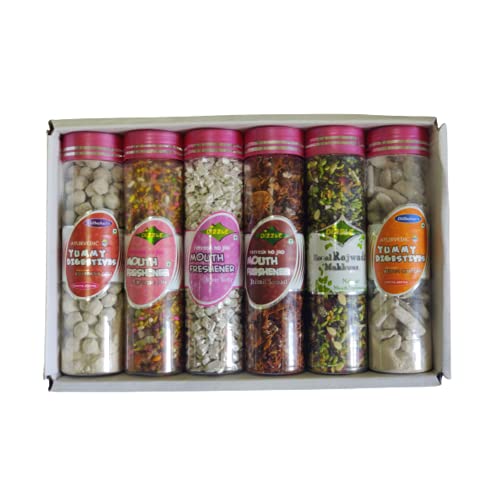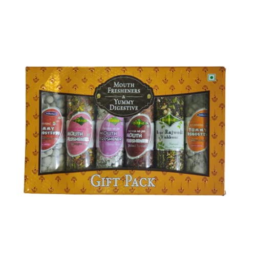 Dilbahar Gift Pack Special is a combo of mostly liked yummy digestive churans and mouth fresheners. It contains 210g Bottle of Anardana Goli 200g of Satrangi Mix 200g of Silver Softy 150g of Jhilmil Supari 210g of Royal Rajwadi Mukhwas and 165g of Aplam Chaplam Khatta Mitha Aam Papad.