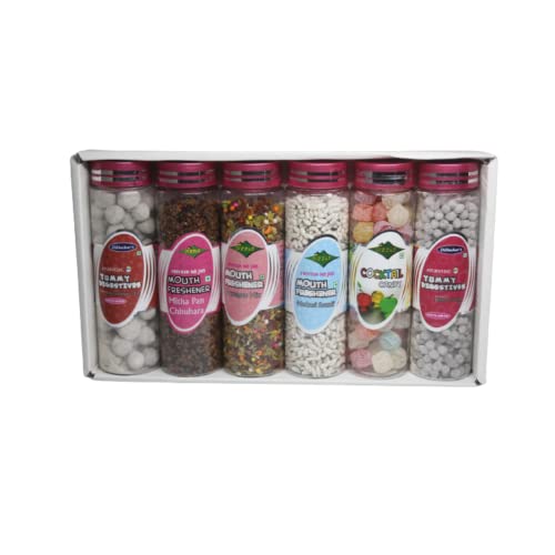 It is a combo of 6 different types flavours of yummy digestives churans and mouth freshener which includes Anardana Goli 210 GM Jeera Goli Special 220g Mitha Pan Chhuhara 140 GM Satrangi Mukhwas 200 GM Madrasi Sonff 180 GM and Cocktail Candy 220 GM. Dilbahar yumy digestive & mouth freshener gift packs are best suit for weddings festival & corporate giftings.