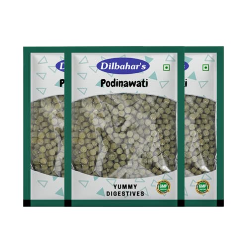Dilbahar's Podinawati Goli offers a refreshing mint-flavored digestive aid and mouth freshener designed to help soothe acidity and promote better digestion after meals. Made with high-quality pudina (mint) this pachak goli provides a cooling sensation while supporting digestive health. The mint flavor not only freshens your breath but also acts as a natural remedy for indigestion bloating and other digestive discomforts.Each 400g pack (Pack of 3) is perfect for sharing or enjoying individually offering a long-lasting refreshing experience after meals. The pudina goli serves as a great way to finish your meal ensuring fresh breath while also helping to alleviate acidity and other digestive issues. It's an excellent choice for those looking for a natural and effective digestive aid.Dilbahar's Podinawati Goli is made with premium ingredients to ensure the highest standards of quality and freshness. It is a trusted digestive solution that helps keep your digestive system in check while refreshing your mouth. Enjoy the cooling mint flavor and digestive benefits after each meal with this convenient and enjoyable product.
