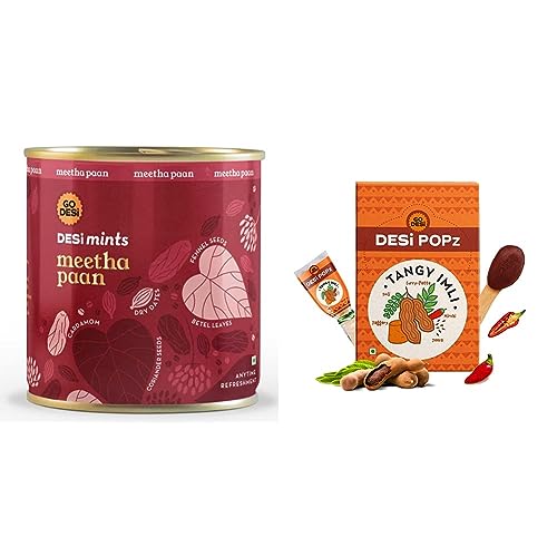 Go Desi Meetha Paan Mouth fresheners Desi Mints Refreshing Mouthfreshener Mukhwas (2 x 90g)GO DESi Mints- a range of refreshing Mukhwas in 5 exciting variants. Made using fennel seeds sourced directly from the foothills of Mount Abu and processed using age-old techniques experience the authentic taste of paan with DESi Mints- Meetha Paan. Refreshing menthol and elaichi meets sweet dates and gulkand to create a refreshing after-meal treat as old as time.GO DESi Imli Pop Tamarind & Jaggery Candy | 50 Pieces | Tangy Imli | Imli Candy | Lollipop | Digestive CandyImli pop or Tamarind Candy is an age-old traditional spicy sour treat made with fresh and natural tamarind jaggery chilli and curry leaves. Made by hand in small rural kitchens. Every lick will take you back to your childhood. Unlike other packaged food go desi products are not made at a factory they are handmade by women from rural areas.