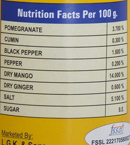 Ingredients: Pomegranate Cumin Black Pepper Black Salt Dry Mango Dry Ginger And Sugar Aniseed Menthol Permitted Colours