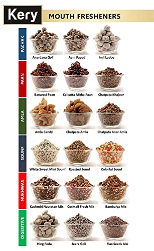 100% Natural & Authentic Indian Taste Premium Packaging comes in a handy air tight jar bottle pack so the flavors & variety don't escape easily. Prepared processed and packed in a very hygienic condition to ensure better quality and authentic flavour. Our Mukhwas Set is infused with the goodness of fruits organic herbs and ingredients which are proven to be beneficial for health & digestion.This Indian after-meal snack is used for digestion widely used as a mouth freshener especially after meals.At Kery we produce only the best and so the dry ingredients used to make our are sourced exclusively from responsible farmers and producers. With the use of best industry practices we produce the highest quality snacks.Try all Pachak Ladoo Khajoor Aam Papad Jeeragoli White Sauf Banarasi Pan Anardana & Navratan Mukhvas.