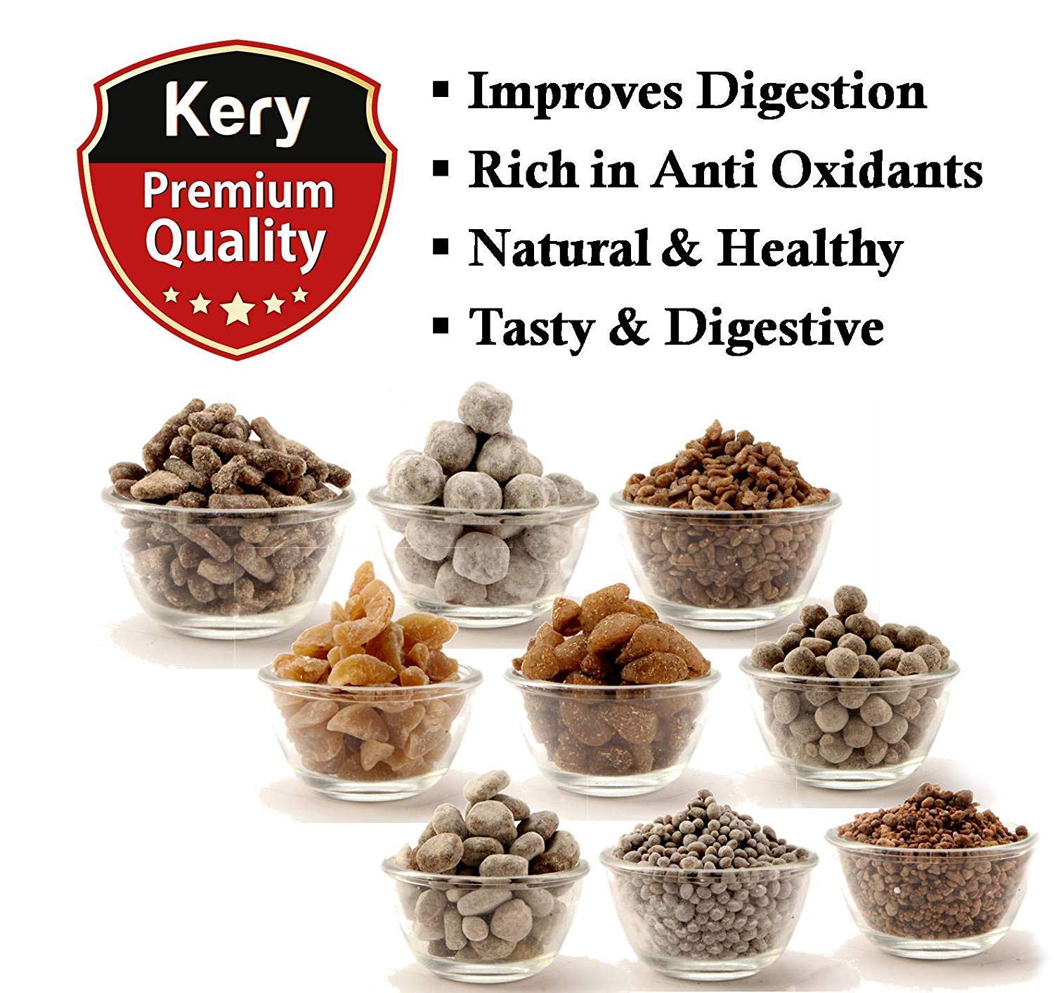 100% Natural & Authentic Indian Taste Premium Packaging comes in a handy air tight jar bottle pack so the flavors & variety don't escape easily. Prepared processed and packed in a very hygienic condition to ensure better quality and authentic flavour. Our Mukhwas Set is infused with the goodness of fruits organic herbs and ingredients which are proven to be beneficial for health & digestion.This Indian after-meal snack is used for digestion widely used as a mouth freshener especially after meals.At Kery we produce only the best and so the dry ingredients used to make our are sourced exclusively from responsible farmers and producers. With the use of best industry practices we produce the highest quality snacks.Try all Pachak Ladoo Khajoor Aam Papad Jeeragoli White Sauf Banarasi Pan Anardana & Navratan Mukhvas.