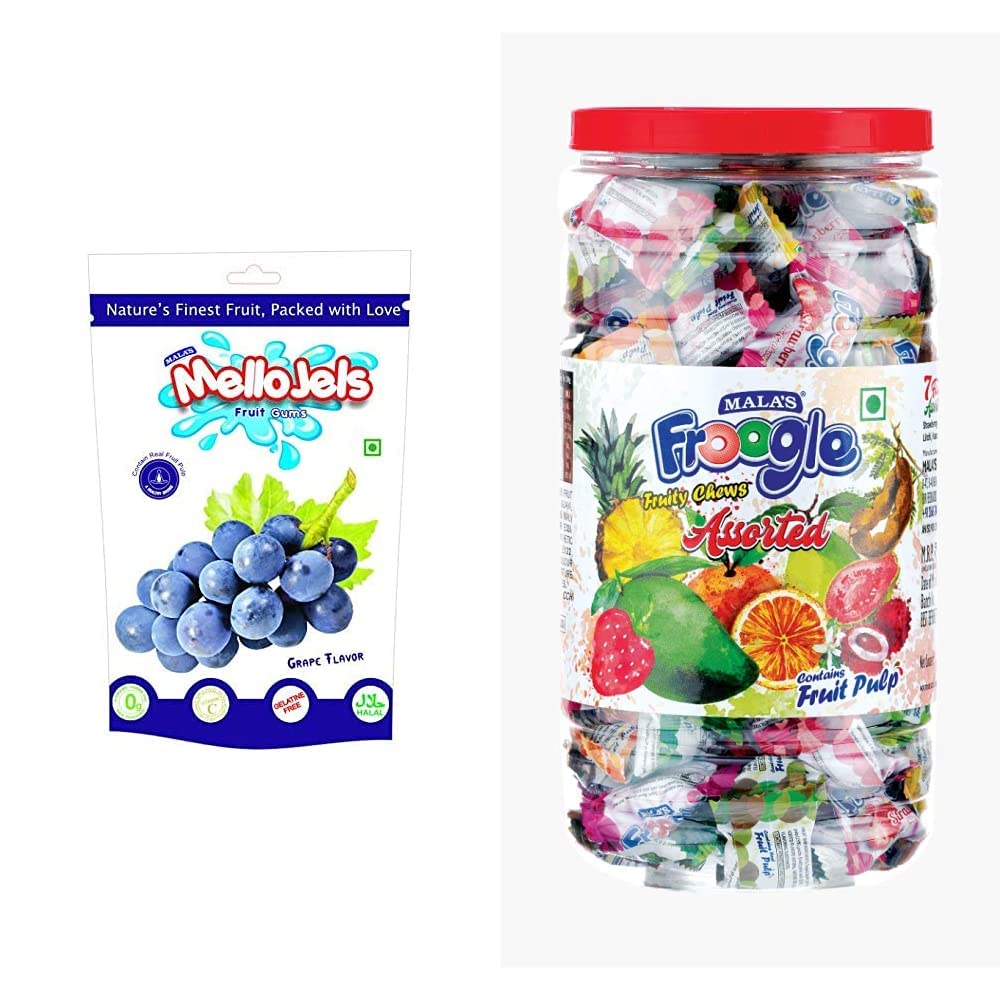 Mala's MelloJels Fruity Candies Black Grape 3 countMade from Real fruit Pulp ContainMala's Assorted Froogle Jar 600 gMala's most hot seller froogle the fruity chews bite into this delicious fruity chunky and juicy fruit bars. They are made up with real fruit pulp. Froogle is made to perfection and is loved by all age groups.