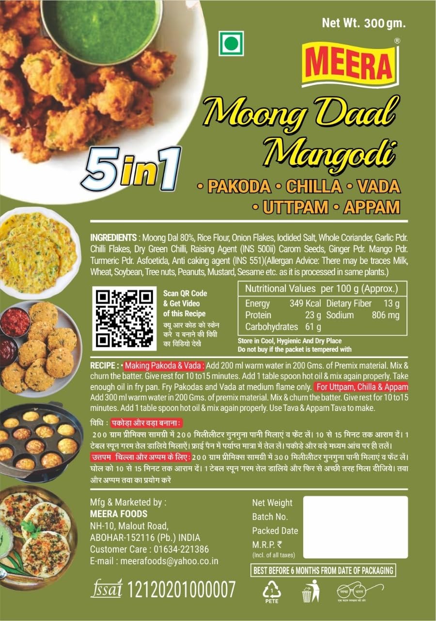 Making pakoda & Vada : Add 200ml warm water in 200 gms. of premix material. Mix & chum the batter. Give rest for 10 to 15 minutes. Add 1 Table spoon hot oil & mix again properly. Take enough oil in fry pan. Fry Pakodas and Vada at medium flame only. For Uttapam Chilla & Appam Add 300 ml warm water in 200gms. of premix . Mix & Churn the batter. Give rest for 10 to 15 minutes. Add 1 table spoon hot oil & again mix properly. Use Tava & Appam tava to make.