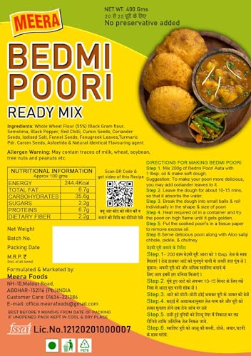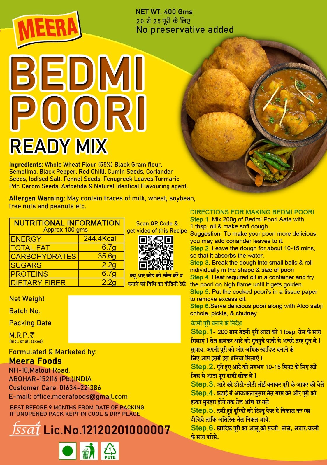 Bedmi Poori is Traditional Masala Poori widely known as Vrindavan Bedai. Bedmi Poori ready mix is prepared with carefully choosen ingredients that creates traditional flavour and next level taste. Bedmi Pooris are enjoyed with Aloo Tamatar Curry. Use of salad & Pickles may add mouth watering also. vedio recipe can be played by scanning QR code given on each pack.