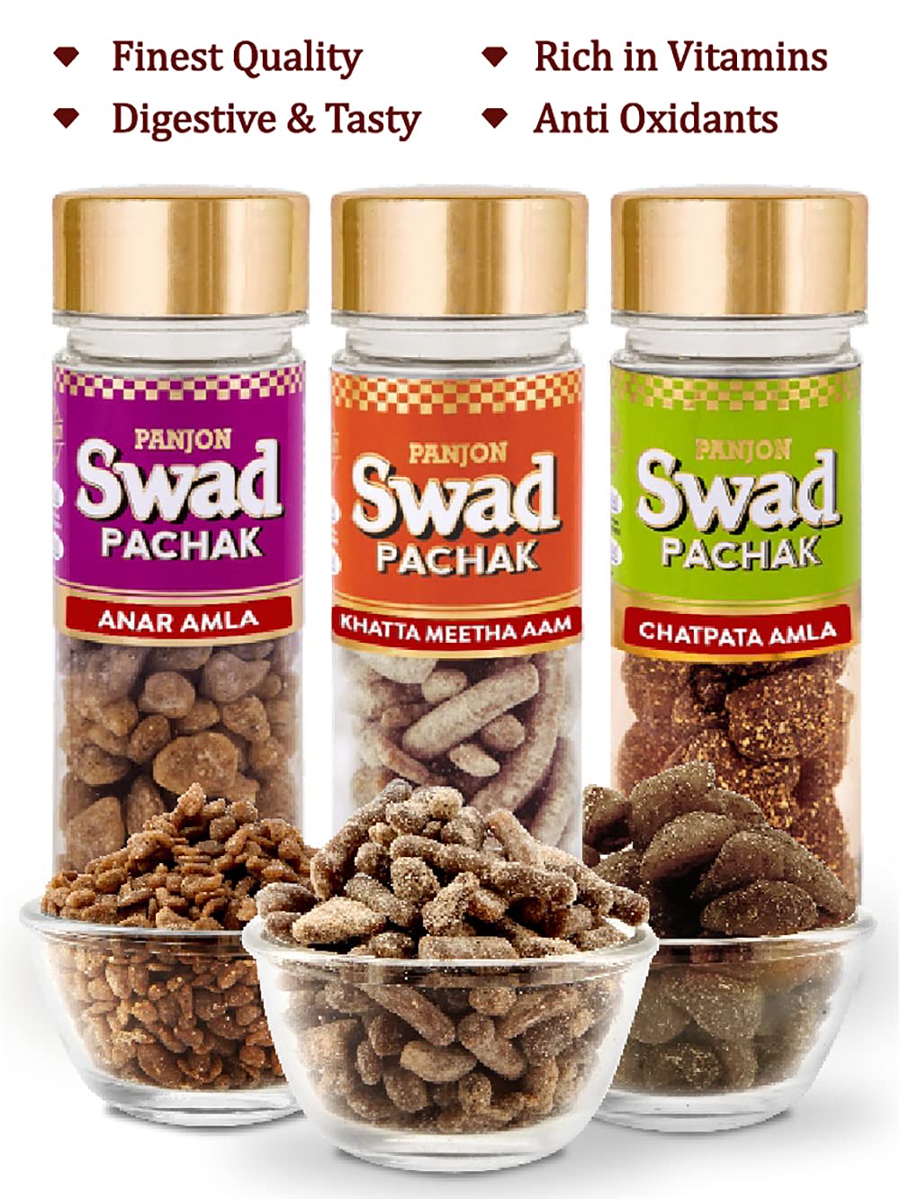 Panjon Swad mukhwas mouth fresheners Swad by Panjon is a made in India brand a pioneer in health products since 1977 present their premium range of Swad candy & Swad mouth fresheners pachak churan mukhwas & Swad chatpati toffee chocolate candy mouth freshener. Swad pachak mukhwas are infused with the goodness of handpicked fruits and best quality ingredients to stimulate the digestive enzymes and act as an appetizer. It helps in digestion & improves stomach health. Try all 18 flavours of Swad mouth fresheners & 5 flavours of Swad candy: original kachcha aam imli guava and lemon candies toffee!!!! Swad mouth fresheners range includes: anardana goli aam papad jeera goli white sweet saunf colourful saunf supari flax seeds banarasi paan rasily mitha Calcutta paan mouth freshener saunf fennel fresh mix paan toffee shahi navratan mix pan mukhwas anar amla chatpata khajoor Swad imli ram ladoo mumbaiya mukhwas hajmola delight foods Mr. Merchant hing peda amla candy chatpata amla and more. Gourmet nuts berries supari seeds & trail mixes. Try all our 20 flavours to tickle your taste buds. Veg e wagon chandan midiron to maintain freshness shake the bottle upside down and keep it in a cool and dry place. Mahek paan this product is 100% vegetarian. Dizzle the goodness of the ingredients that come together in this will enhance your immunity and promote healthy digestion. Alpenliebe Cadbury pulse pass pass Baba elaichi Nestle KitKat eclairs coffee kopiko sapphire living its most popular slogan "chahe jitna bhi khao Swad se pachao" From grandfathers to grandchildren Swad is a family's favourite candy. Keep in a cool and dry place. Swadâs chatpata masala will leave you amazed what's more it is a great treat to your stomach too. Swad is a product that is universally relished by people of all ages. Swad's khatta meetha taste is the best way to enjoy while staying healthy.