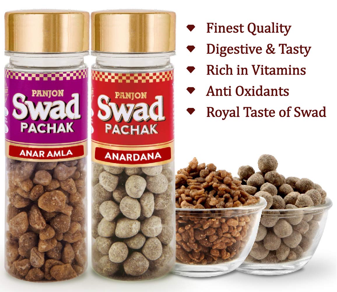 100% NATURAL MOUTH FRESHENERS: Infused with the goodness of Hand Picked fruits & ingredients Swad Pachak Mukhwas are best for Digestion & help in stomach health. Signature taste relished by all age groups. Panjon Swad Anardana Goli & Anar Amla Pachak (Mou