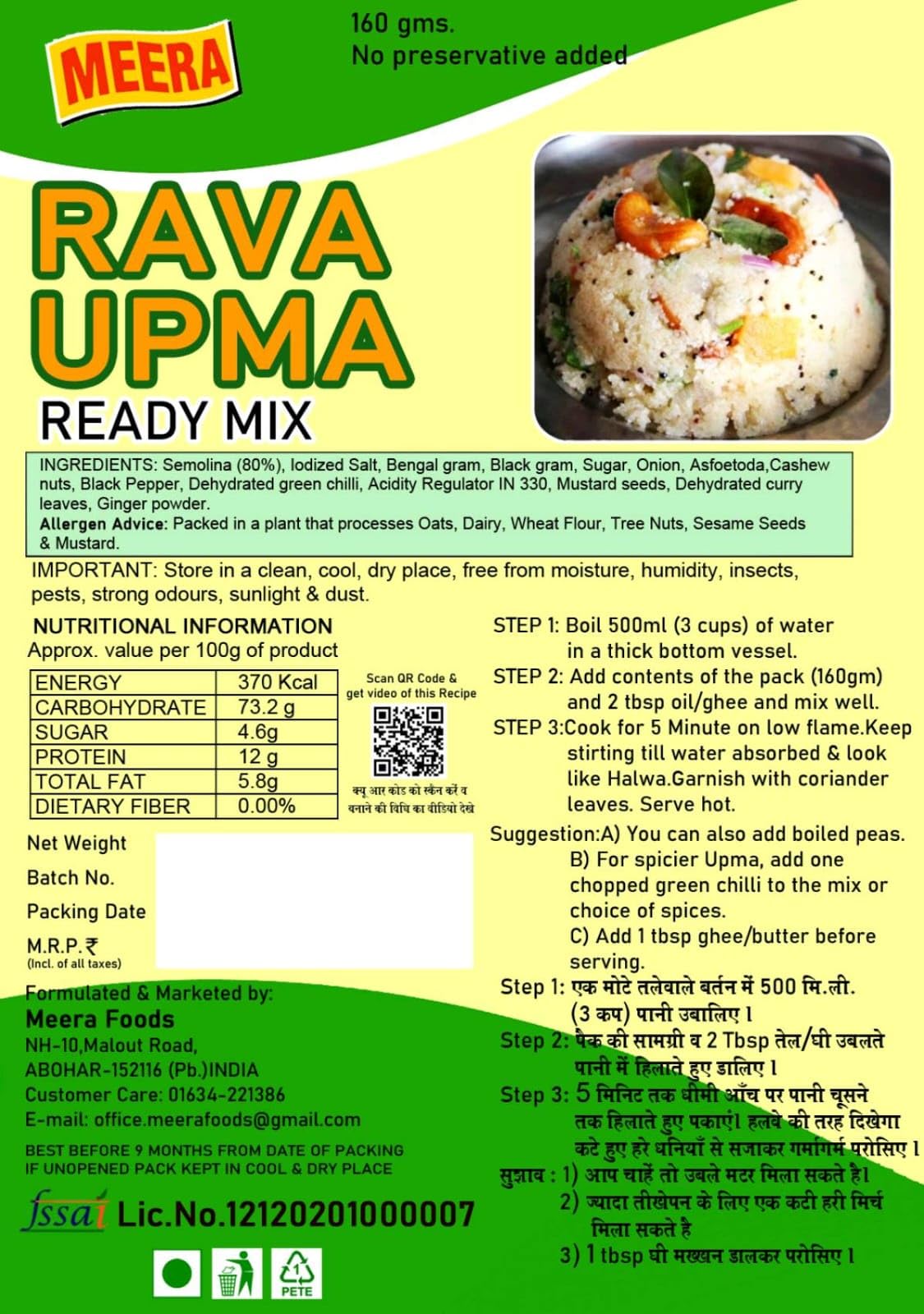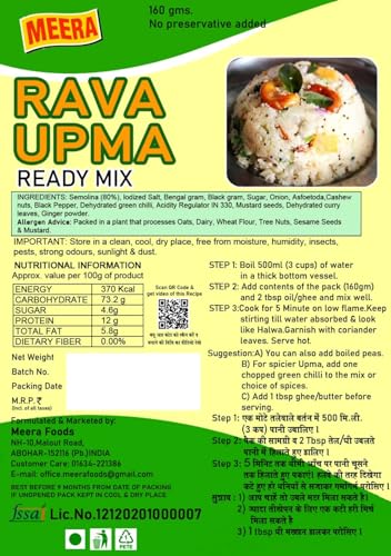Boil 500ml (3 cups) of water in a thick bottom vessel. Add contents of the pack and 2 table spoon oil/ghee and mix well. Cook for 5 minutes on low flames. Keep stirting till water absorbed & look like halwa. Garnish with coriander leaves & serve hot. You can also add boiled peas. For spicier Upma add one chopped green chilli to mix or choice of spices. Add 1 table spoon ghee/ butter before serving.