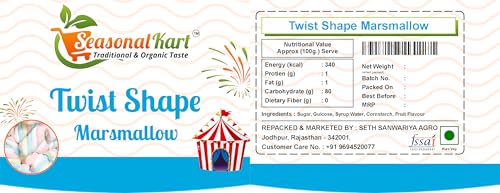 Indulge in the whimsical delight of SeasonalKart's Twist Shape Marshmallows a perfect treat that brings carnival-style fun to your snacking experience. These soft pillowy marshmallows come in enchanting twisted shapes with delicate pastel hues of pink and blue making them visually appealing for parties and special occasions. Each piece offers a delightful combination of sweetness and cloud-like texture that melts in your mouth. With 340 kcal per 100g serving these vegetarian marshmallows are crafted using quality ingredients including sugar glucose and fruit flavouring. The convenient jar packaging keeps them fresh and ready to enjoy. Whether you're decorating hot chocolate creating desserts or simply enjoying them as is these marshmallows add a touch of whimsy to your sweet moments. Perfect for birthday parties festive celebrations or as a delightful treat for marshmallow enthusiasts of all ages.