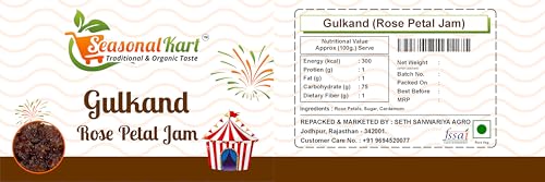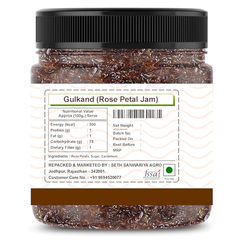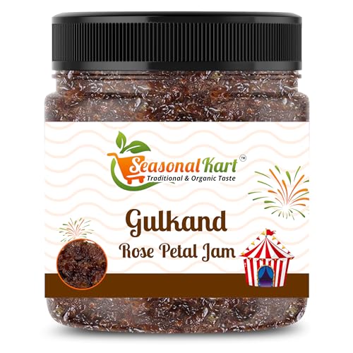 Discover the exquisite taste of Seasonal Kart's Gulkand Rose Petal Jam a traditional Indian delicacy crafted with carefully selected rose petals sugar and aromatic cardamom. This pure vegetarian jam offers a perfect blend of sweet and floral flavours that can enhance your culinary experiences. Each 100g serving provides 300 kcal of energy with a balanced nutritional profile including 75g of carbohydrates. The rich dark-coloured preserve maintains the authentic taste and texture that Gulkand is celebrated for. Perfect for spreading on bread adding to desserts or enjoying as a sweet treat on its own. This premium quality rose petal jam comes in a convenient jar packaging that helps maintain its freshness. Produced in Jodhpur Rajasthan this FSSAI-certified product brings the traditional taste of India to your table. Store in a cool dry place and check the batch details for freshness.