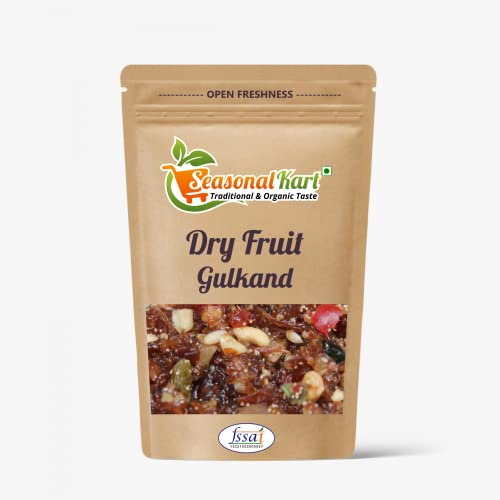 Seasonal Kart Organic & Natural Gulkand with Dry Fruits | | Export Grade / Sun Cooked| Healthy Dry Fruits Preserve Gulkand Jam with Natural Fragrance and Flavour |Gulkand with Dry Fruits is a sweet and delicious dessert made by sun-drying damask rose petals rock sugar exposed in sun over a period of one month and then mixed with rich dark Dry Fruits and Choco Chips. This unique Dry Fruits Gulkand consists of a blend of Gulkand Rose Petals with Dry Fruits filled with Dry Fruits in every bite. This Gulkand with Dry Fruits will give you a classic fudge-like earthy flavor of dark Dry Fruits. Explore Heavenly Dark Dry Fruits taste as you indulge in this delectable filled Dry Fruits Gulkand for a unique multi-textural experience as you bite into an intense dark Dry Fruits Gulkand. Dry Fruits helps regulate the feel-good hormones serotonin and dopamine and can lift the mood. Gulkand is rich in antioxidants thus acts as an energy booster. It detoxifies your body from the inside and its cooling effect prevents internal heat especially during summers. Gulkand helps reduce acidity and stomach heat and prevents any swelling in the intestine. Gulkand is a very good digestive tonic and helps improve appetite digestion and digestive problems. Benefits: Gulkand is a powerful antioxidant and a very good rejuvenator. Gulkand helps to reduce acidity and stomach heat. Gulkand helps to treat mouth ulcers strengthens teeth and gums. A very good digestive tonic - helps to improve appetite improves digestion and corrects digestive problems. It has a calming effect on the nervous system thus helping in reducing stress. It acts as a natural coolant and cools off our entire system.Gulkand is known to reduce stress strengthen the heart and central nervous system. Gulkand Calms and Cools the Body Gulkand boosts energy How to use: Take 1-2 teaspoons of Gulkand with Dry Fruits. Swallow it with water or milk
