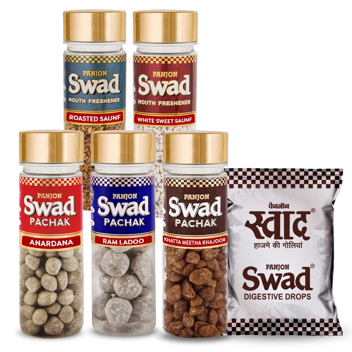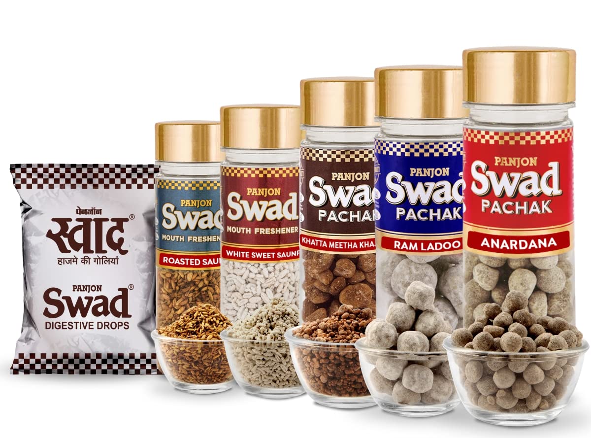 Swad Candy Pack Anardana Imli Ram Laddoo Khajoor White sweet Saunf Roasted Saunf Mukhwas 25 Toffee (6 Units) Swad's premium range of mouth fresheners and pachak like anardana jeeragoli aam papad imli laddoo rajasthani saunf navratan mix mukhwas and many more are amongst india's best brands for mouth fresheners. Try all our 20 flavours of swad pachak and mouthfresheners. Swad products are good for digestion & stomach acidity gas bloating niversally relished by people of all ages. Our ayurveda-based preparation are purely made of herbal ingredients which gives our products the best of nature and health. Swad has been a proud brand of panjon limited since 40 glorious years. And enjoys a tremendous place in every indian's heart. Living its most popular slogan - chahe jitna bhi khao swad se pachao.