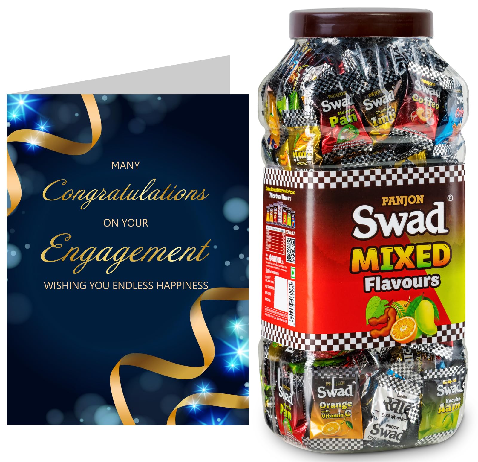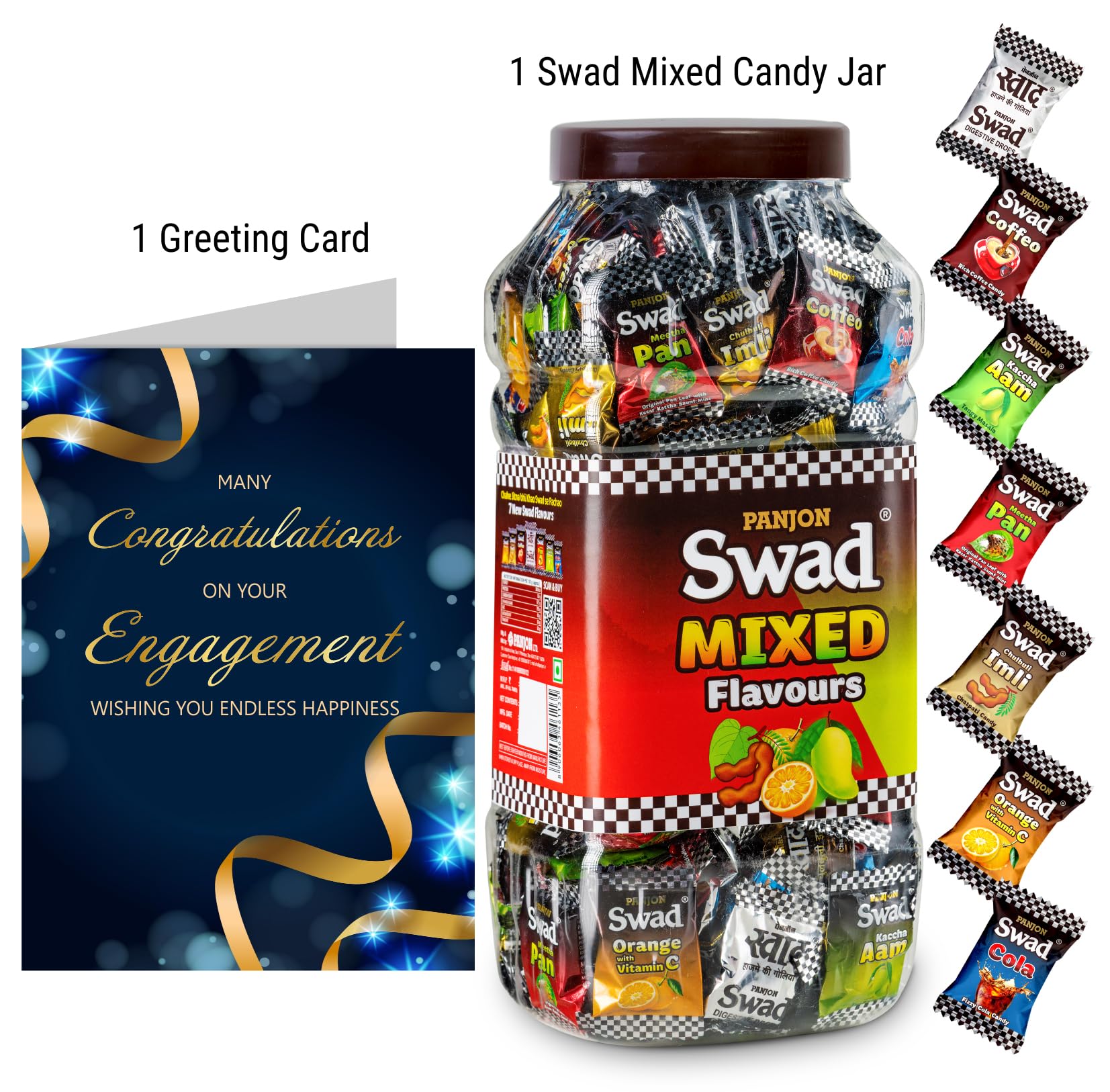 Swad Gift for Engagement Ceremony Ring Sagai with Card (Swad Mixed Flavours Candy 150 Jar & 1 Greeting card) 2 unitsengagement ceremny ring sagai Gift with Card hamper gifts best unique for greeting message customised customized personalised personalized candy toffee candi chocolate hamper box