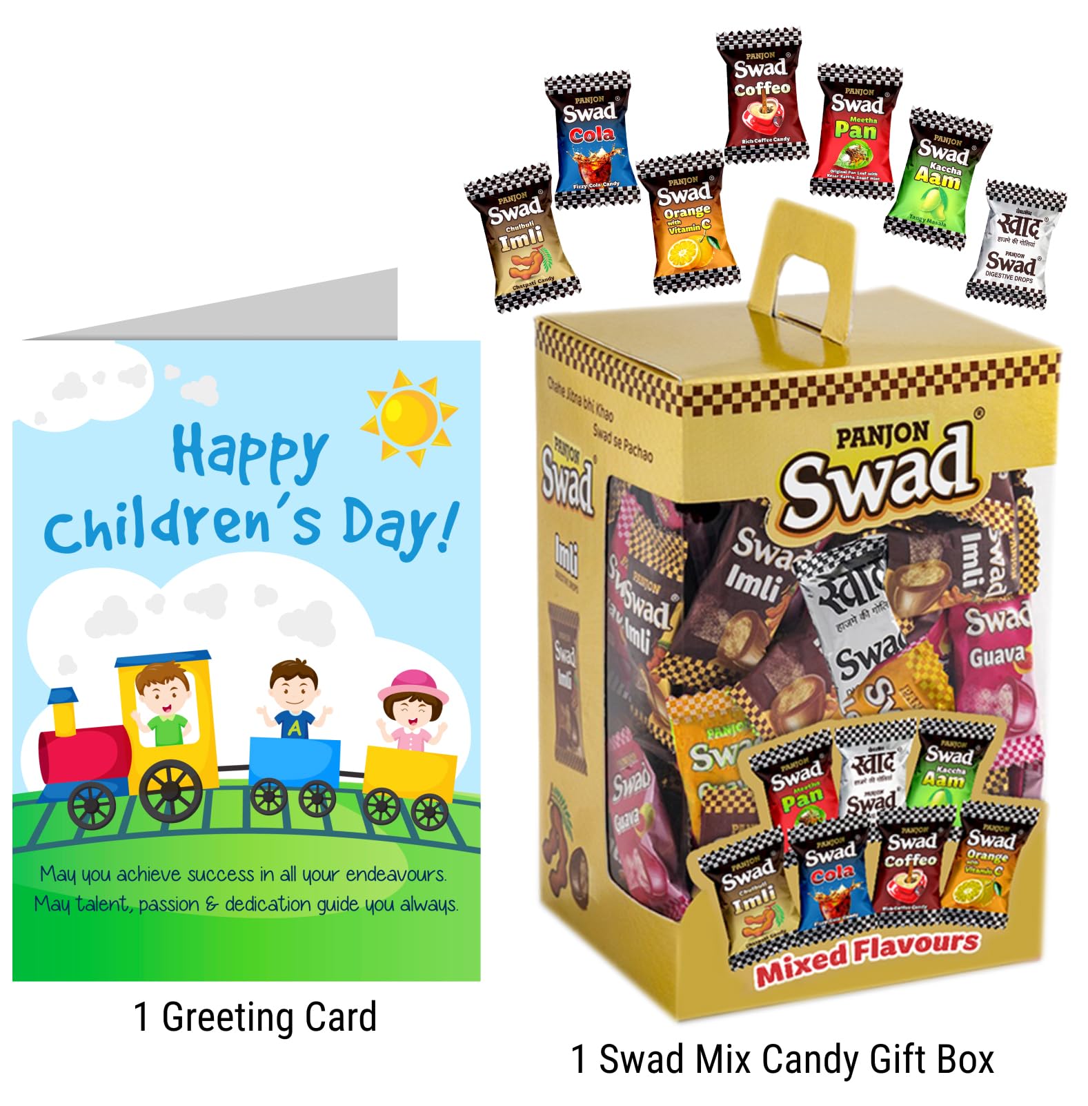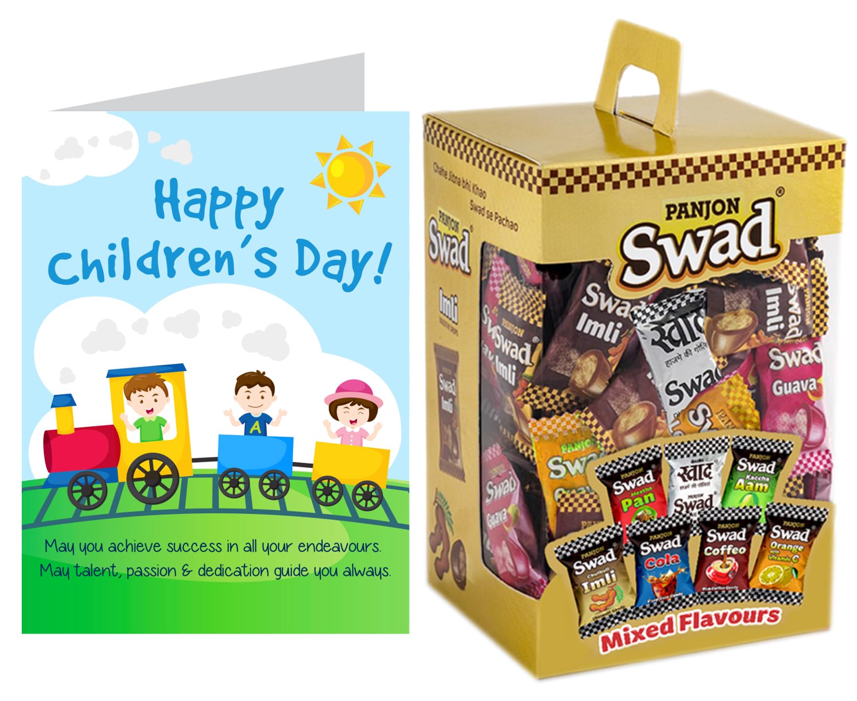 Best Gift for Happy Childrens Day with card in chocolate hamper set Swad Trust Since 1986: India's favourite Digestive confectionery candy brand since 1986. A quality product by Panjon Limited. Swad Digestiveed Candy Jar is made of assorter fruit chewy candy flavours: Kaccha Aam Meetha Pan Imli Cola Coffee & Orange with Vitamin C chocolates Digestive. Swad Candies helps in digestion & acidity. Its signature taste is relished by all age groups. Try all Swad Mouth fresheners: Mukhwas Paan Anardana Imli Khajoor Amla Aam Papad Saunf & Navratan Digestive. with Card hamper gifts best unique for greeting message customised customized personalised personalized candy toffee candi chocolate hamper boxSwad Trust Since 1986: India's favourite Digestive confectionery candy brand since 1986. A quality product by Panjon Limited.Swad Digestiveed Candy Jar is made of assorter fruit chewy candy flavours: Kaccha Aam Meetha Pan Imli Cola Coffee & Orange with Vitamin C chocolates Digestive.Swad Candies helps in digestion & acidity. Its signature taste is relished by all age groups.Try all Swad Mouth fresheners: Mukhwas Paan Anardana Imli Khajoor Amla Aam Papad Saunf & Navratan Digestive.