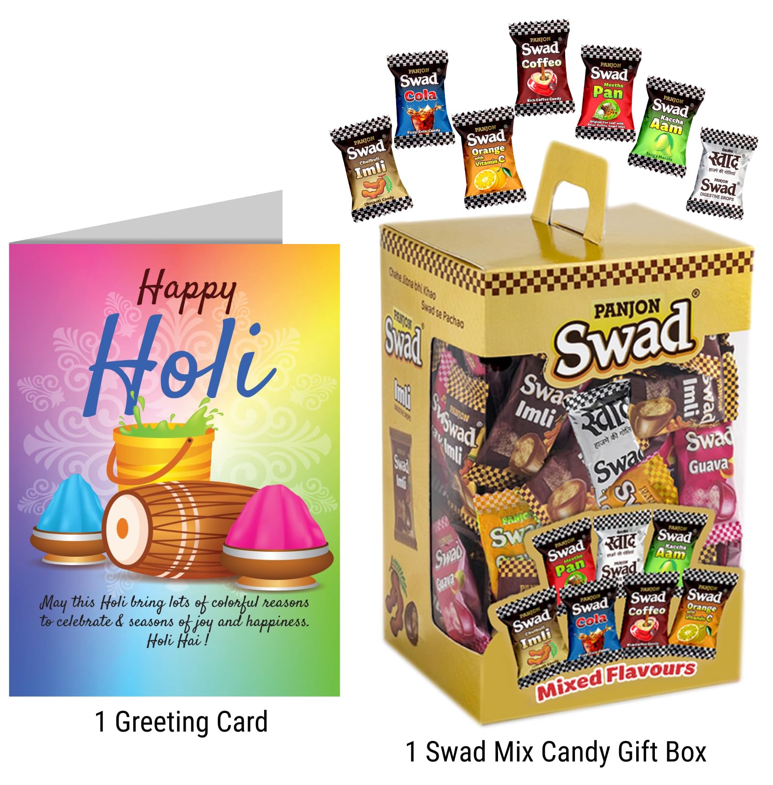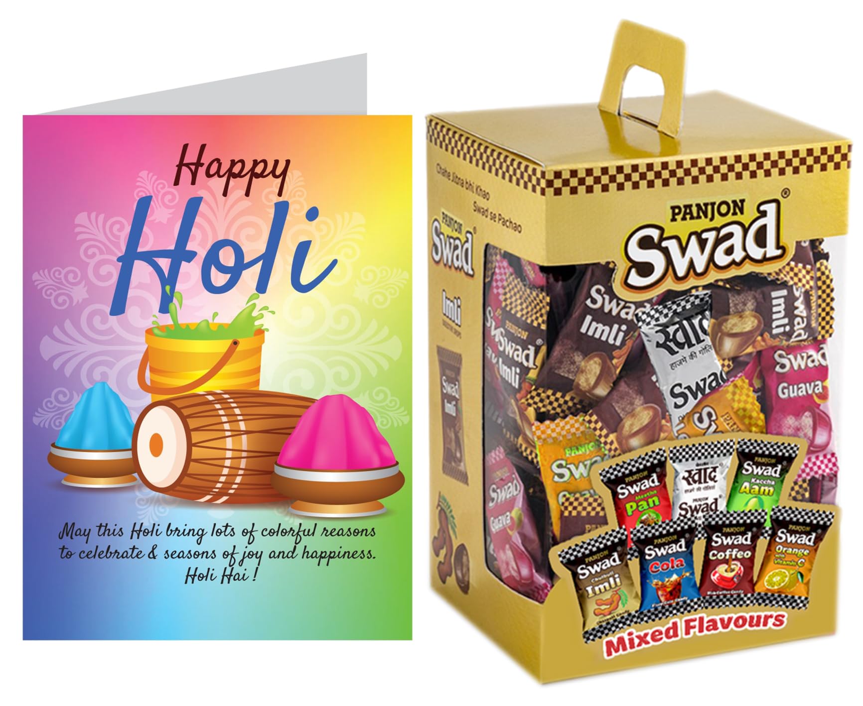 Best Gift for Happy Holi Day with card in chocolate hamper set Swad Trust Since 1986: India's favourite Digestive confectionery candy brand since 1986. A quality product by Panjon Limited. Swad Digestiveed Candy Jar is made of assorter fruit chewy candy flavours: Kaccha Aam Meetha Pan Imli Cola Coffee & Orange with Vitamin C chocolates Digestive. Swad Candies helps in digestion & acidity. Its signature taste is relished by all age groups. Try all Swad Mouth fresheners: Mukhwas Paan Anardana Imli Khajoor Amla Aam Papad Saunf & Navratan Digestive. with Card hamper gifts best unique for greeting message customised customized personalised personalized candy toffee candi chocolate hamper boxSwad Trust Since 1986: India's favourite Digestive confectionery candy brand since 1986. A quality product by Panjon Limited.Swad Digestiveed Candy Jar is made of assorter fruit chewy candy flavours: Kaccha Aam Meetha Pan Imli Cola Coffee & Orange with Vitamin C chocolates Digestive.Swad Candies helps in digestion & acidity. Its signature taste is relished by all age groups.Try all Swad Mouth fresheners: Mukhwas Paan Anardana Imli Khajoor Amla Aam Papad Saunf & Navratan Digestive.