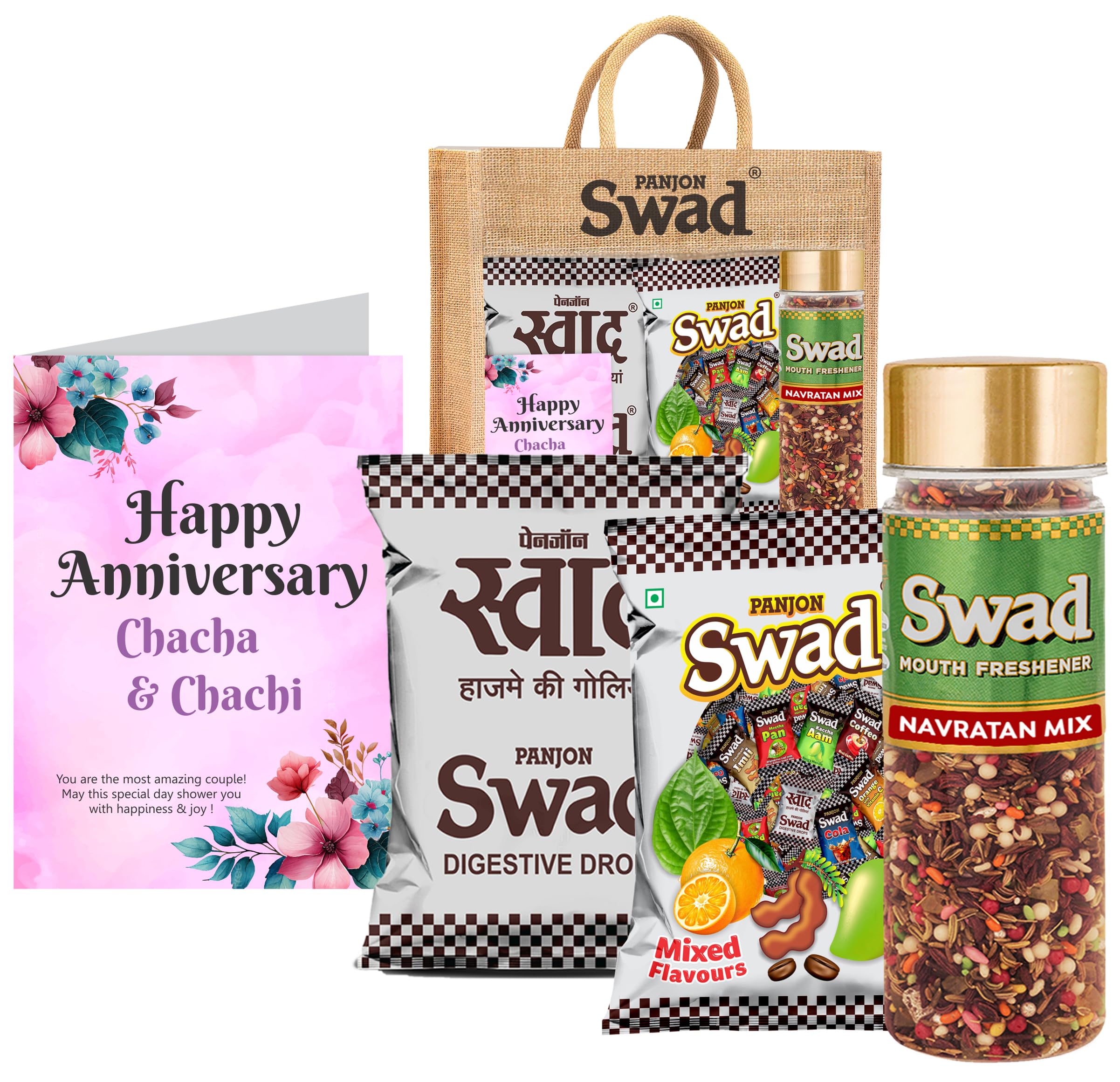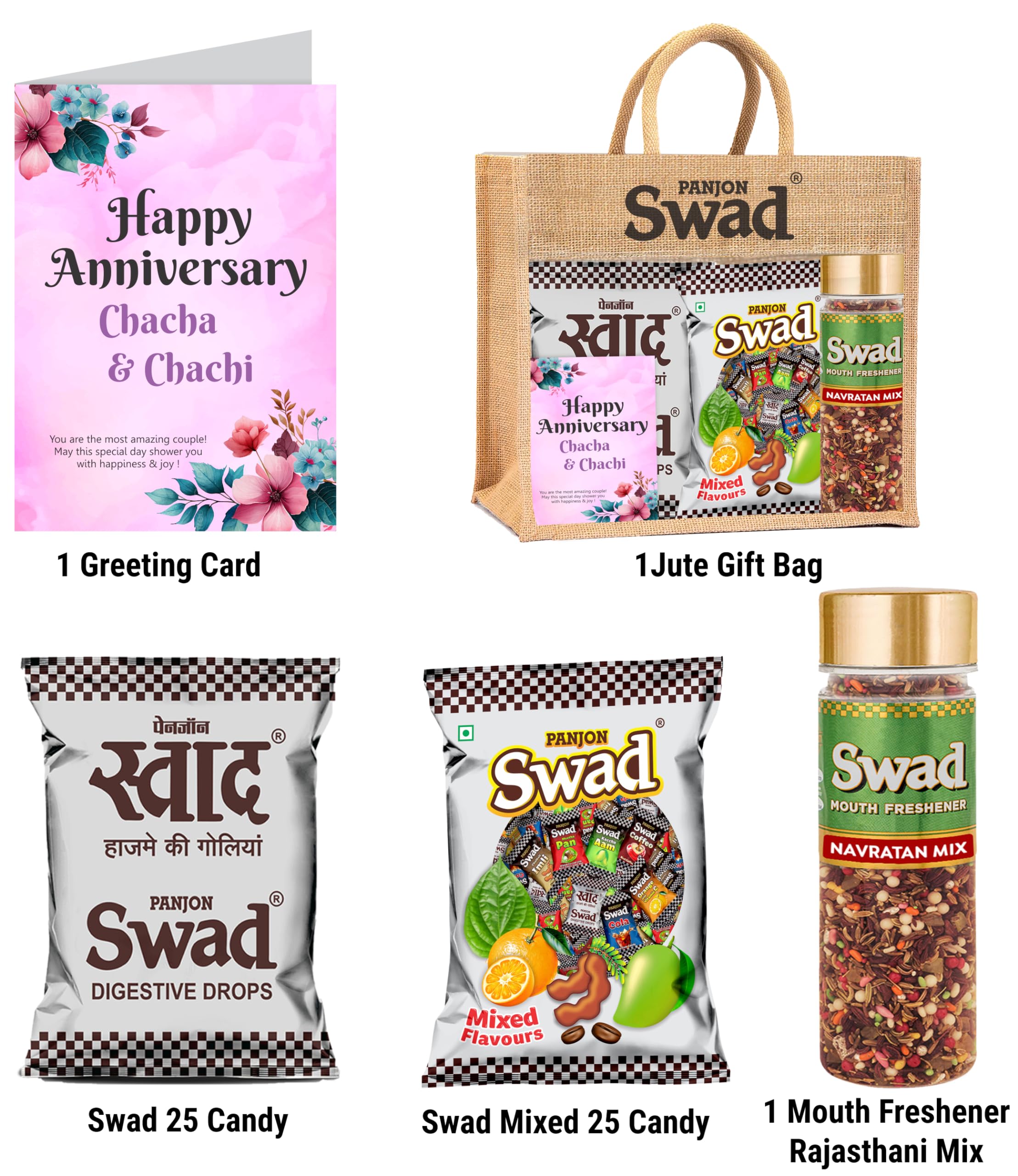 Swad Happy Anniversary Chacha Chachi Gift with Card (25 Swad Candy 25 Mixed Toffee Navratan Mix Mukhwas) in Jute Bag