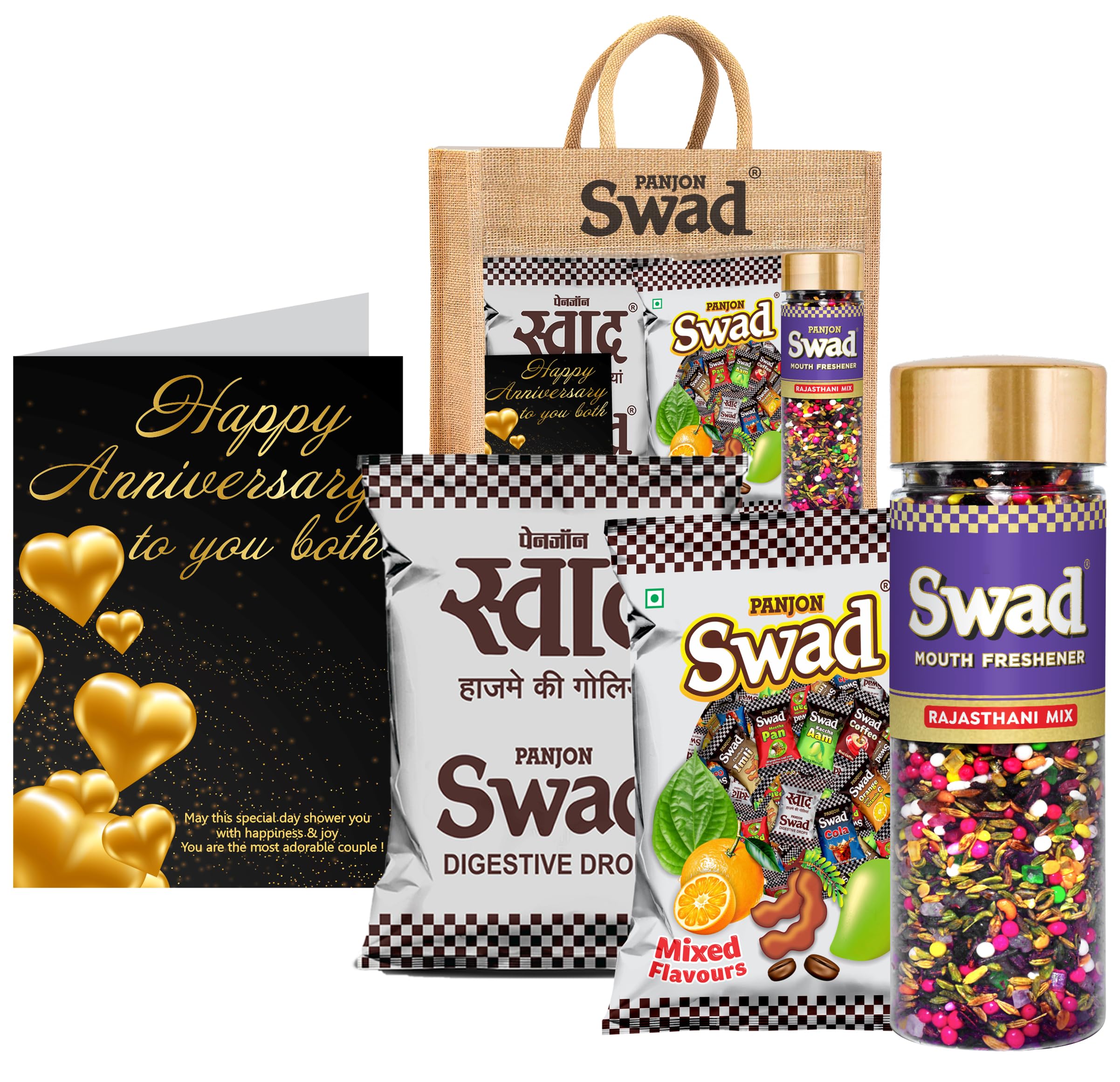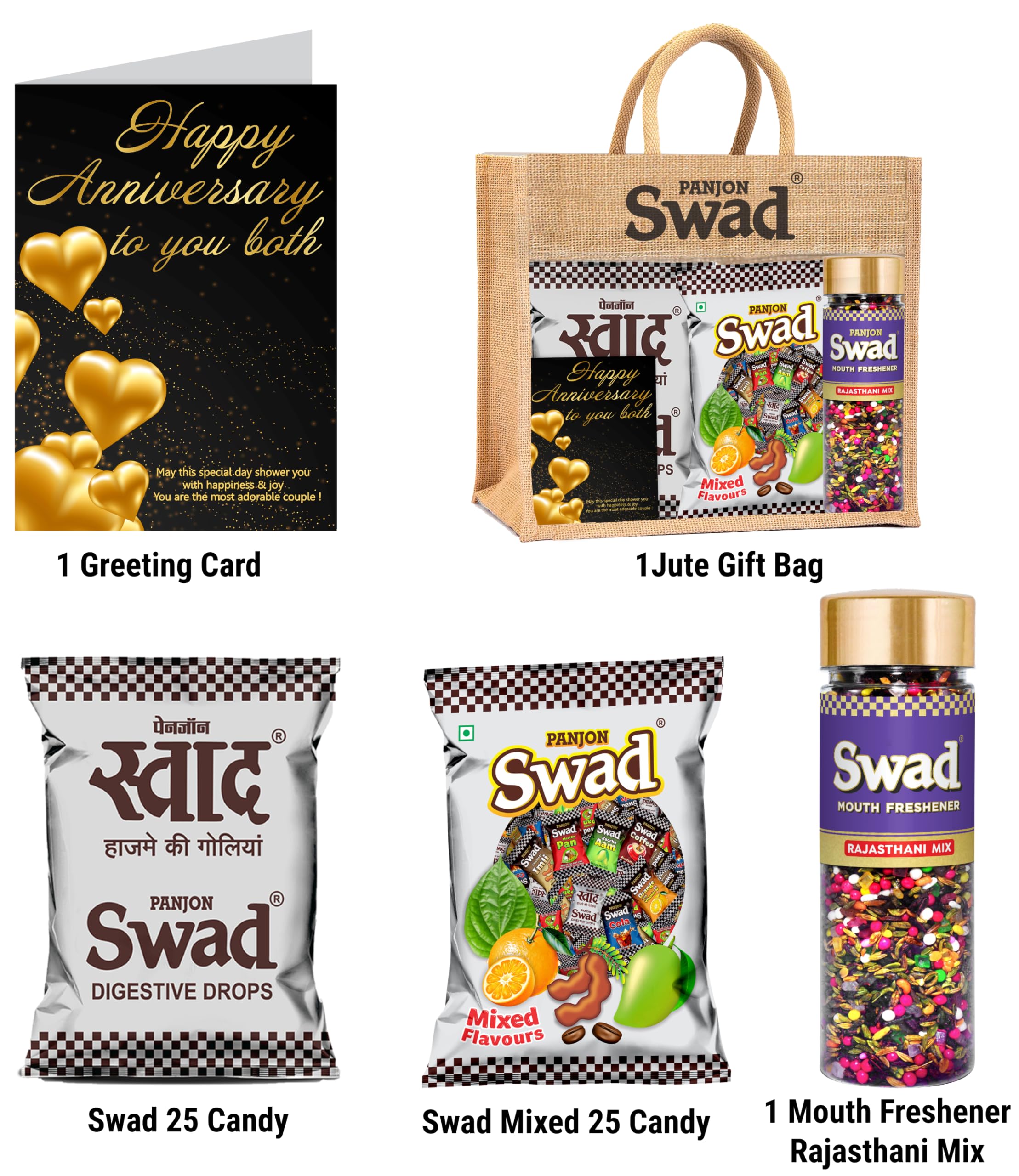 Swad Happy Anniversary Friends Gift with Card (25 Swad Candy 25 Mixed Toffee Rajasthani Mix Mukhwas) in Jute Bag Happy Anniversary Friends Gift with Card hamper gifts best unique for greeting message customised customized personalised personalized candy toffee fragrance scent perfumeSwad Trust Since 1986: India's favourite Digestive confectionery candy brand since 1986. A quality product by Panjon Limited.Swad Candy & Mukhwas Mouth fresheners range is made of ayurvedic herbal & digestive ingredients. Swad candy flavours: Kaccha Aam Meetha Pan Imli Cola Coffee & Orange with Vitamin C chocolates mix.Try all Swad Mouth fresheners: Mukhwas Paan Anardana Imli Khajoor Amla Aam Papad Saunf & Navratan Mix.