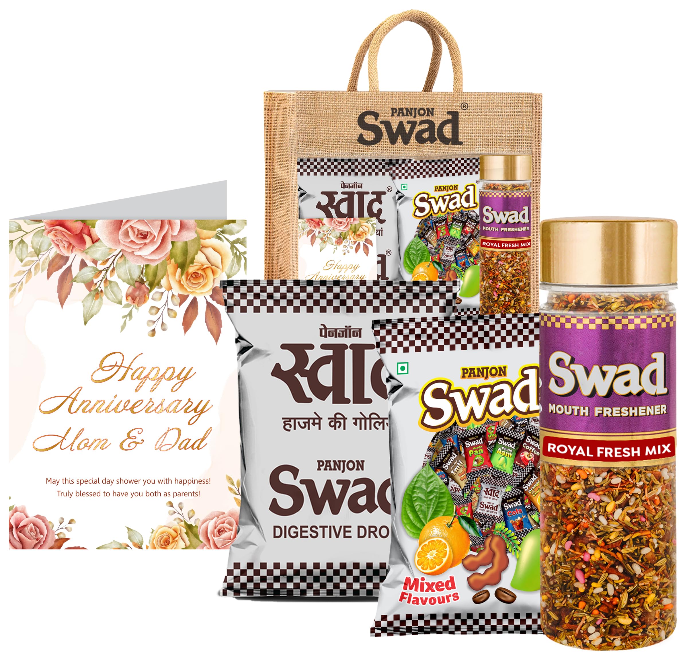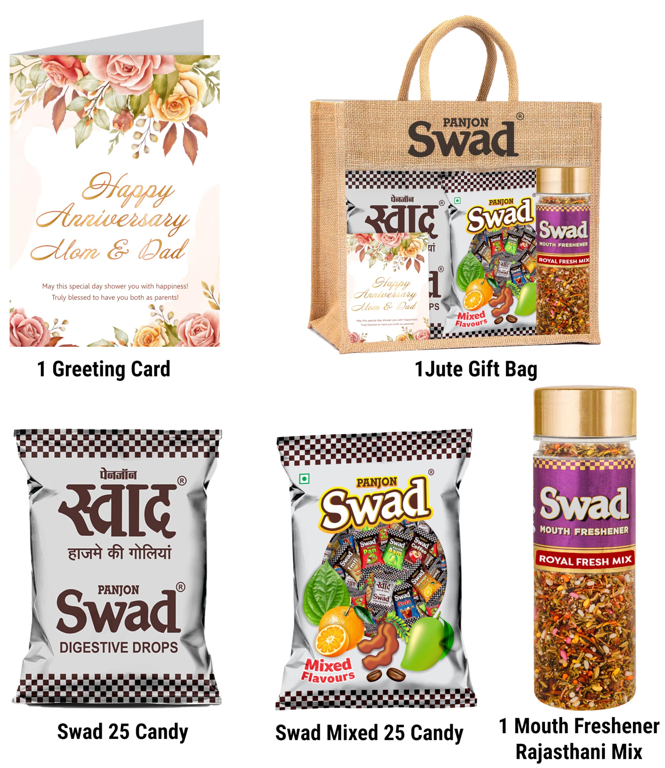 Swad Happy Anniversary Mom Dad Parents Gift with Card (25 Swad Candy 25 Mixed Toffee Royal Fresh Mix Mukhwas) in Jute Bag Happy Anniversary Mom Dad Parents Gift with Card hamper gifts best unique for greeting message customised customized personalised personalized candy toffee fragrance scent perfumeSwad Trust Since 1986: India's favourite Digestive confectionery candy brand since 1986. A quality product by Panjon Limited.Swad Candy & Mukhwas Mouth fresheners range is made of ayurvedic herbal & digestive ingredients. Swad candy flavours: Kaccha Aam Meetha Pan Imli Cola Coffee & Orange with Vitamin C chocolates mix.Try all Swad Mouth fresheners: Mukhwas Paan Anardana Imli Khajoor Amla Aam Papad Saunf & Navratan Mix.