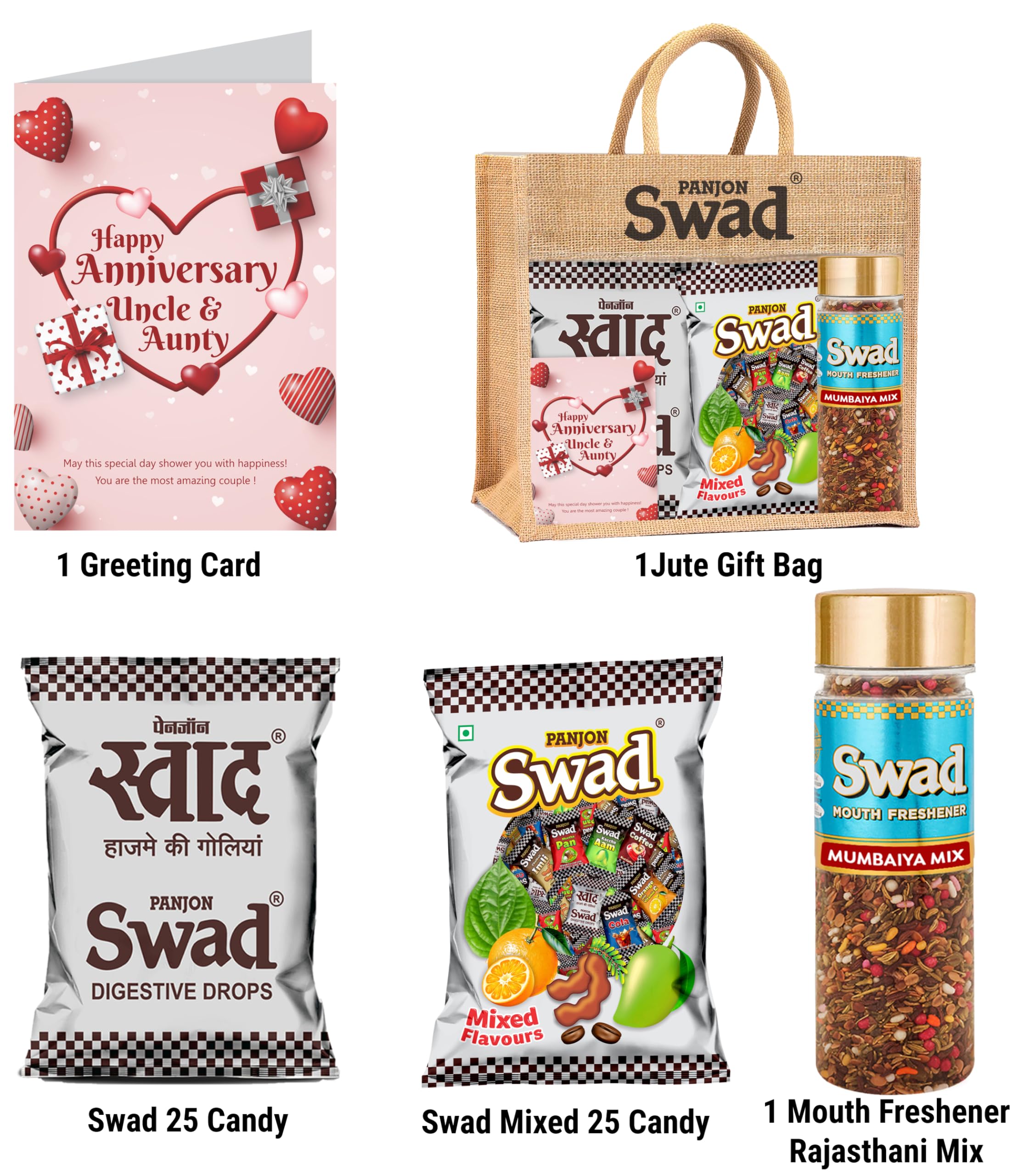 Swad Happy Anniversary Uncle & Aunty Gift with Card (25 Swad Candy 25 Mixed Toffee Mumbaiya Mix Mukhwas) in Jute Bag Happy Anniversary Uncle & Aunty Gift with Card hamper gifts best unique for greeting message customised customized personalised personalized candy toffee fragrance scent perfumeSwad Trust Since 1986: India's favourite Digestive confectionery candy brand since 1986. A quality product by Panjon Limited.Swad Candy & Mukhwas Mouth fresheners range is made of ayurvedic herbal & digestive ingredients. Swad candy flavours: Kaccha Aam Meetha Pan Imli Cola Coffee & Orange with Vitamin C chocolates mix.Try all Swad Mouth fresheners: Mukhwas Paan Anardana Imli Khajoor Amla Aam Papad Saunf & Navratan Mix.