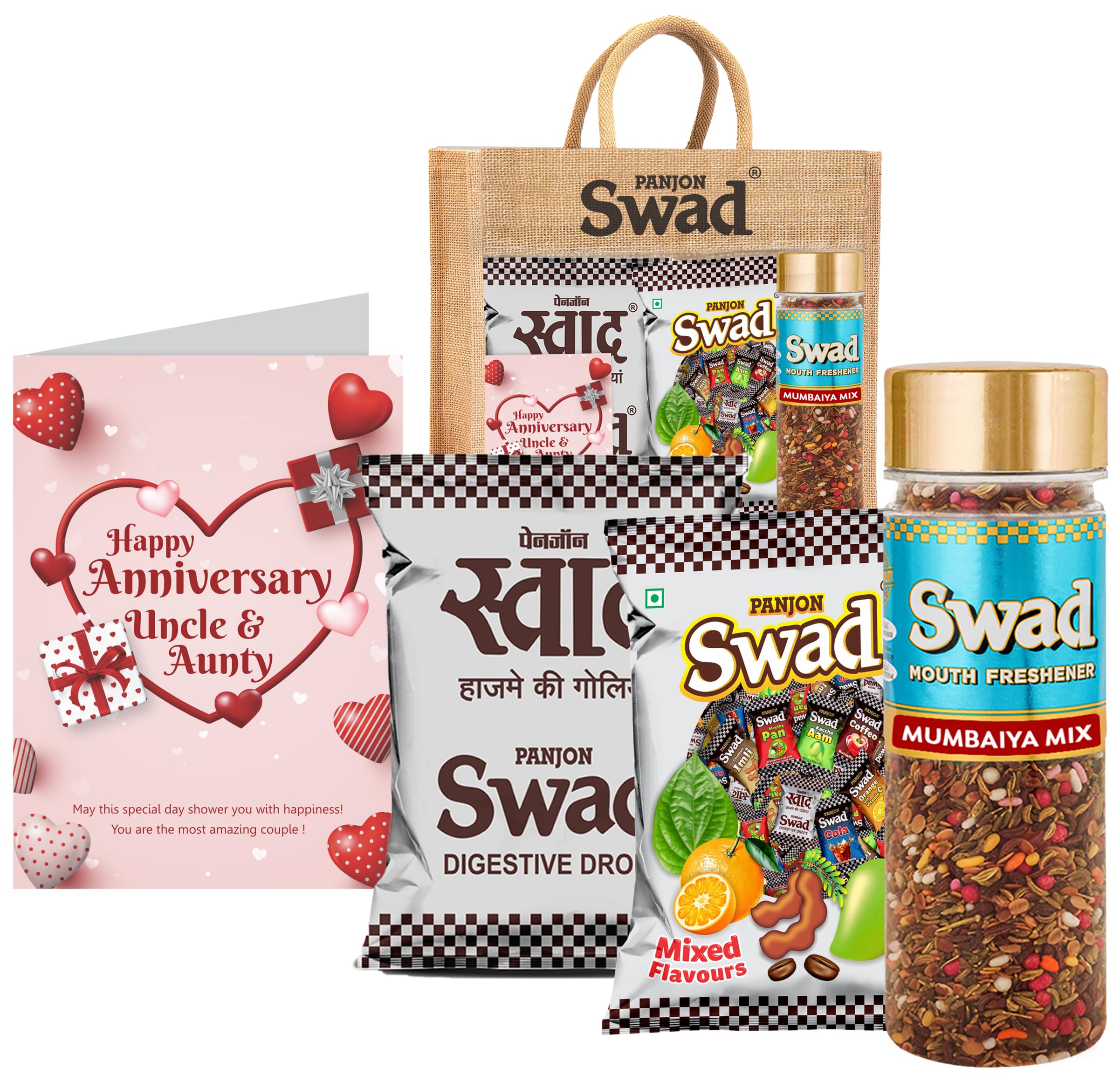 Swad Happy Anniversary Uncle & Aunty Gift with Card (25 Swad Candy 25 Mixed Toffee Mumbaiya Mix Mukhwas) in Jute Bag Happy Anniversary Uncle & Aunty Gift with Card hamper gifts best unique for greeting message customised customized personalised personalized candy toffee fragrance scent perfumeSwad Trust Since 1986: India's favourite Digestive confectionery candy brand since 1986. A quality product by Panjon Limited.Swad Candy & Mukhwas Mouth fresheners range is made of ayurvedic herbal & digestive ingredients. Swad candy flavours: Kaccha Aam Meetha Pan Imli Cola Coffee & Orange with Vitamin C chocolates mix.Try all Swad Mouth fresheners: Mukhwas Paan Anardana Imli Khajoor Amla Aam Papad Saunf & Navratan Mix.