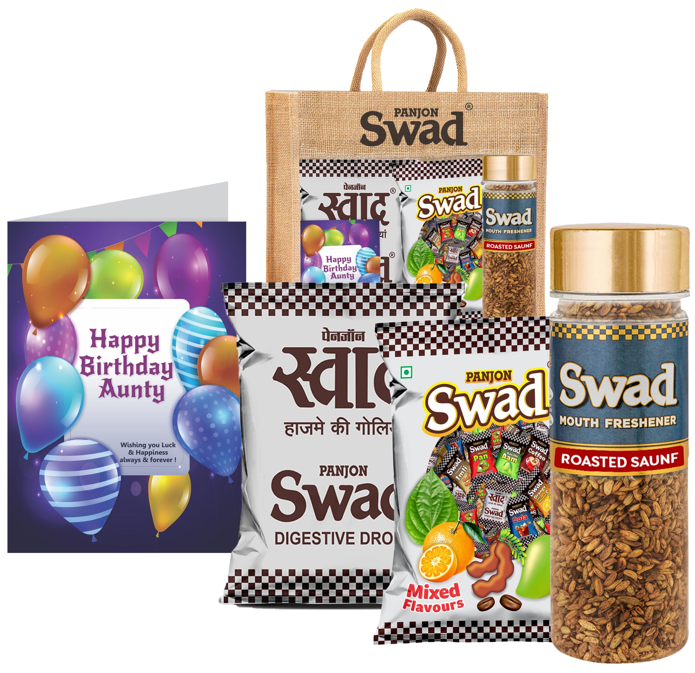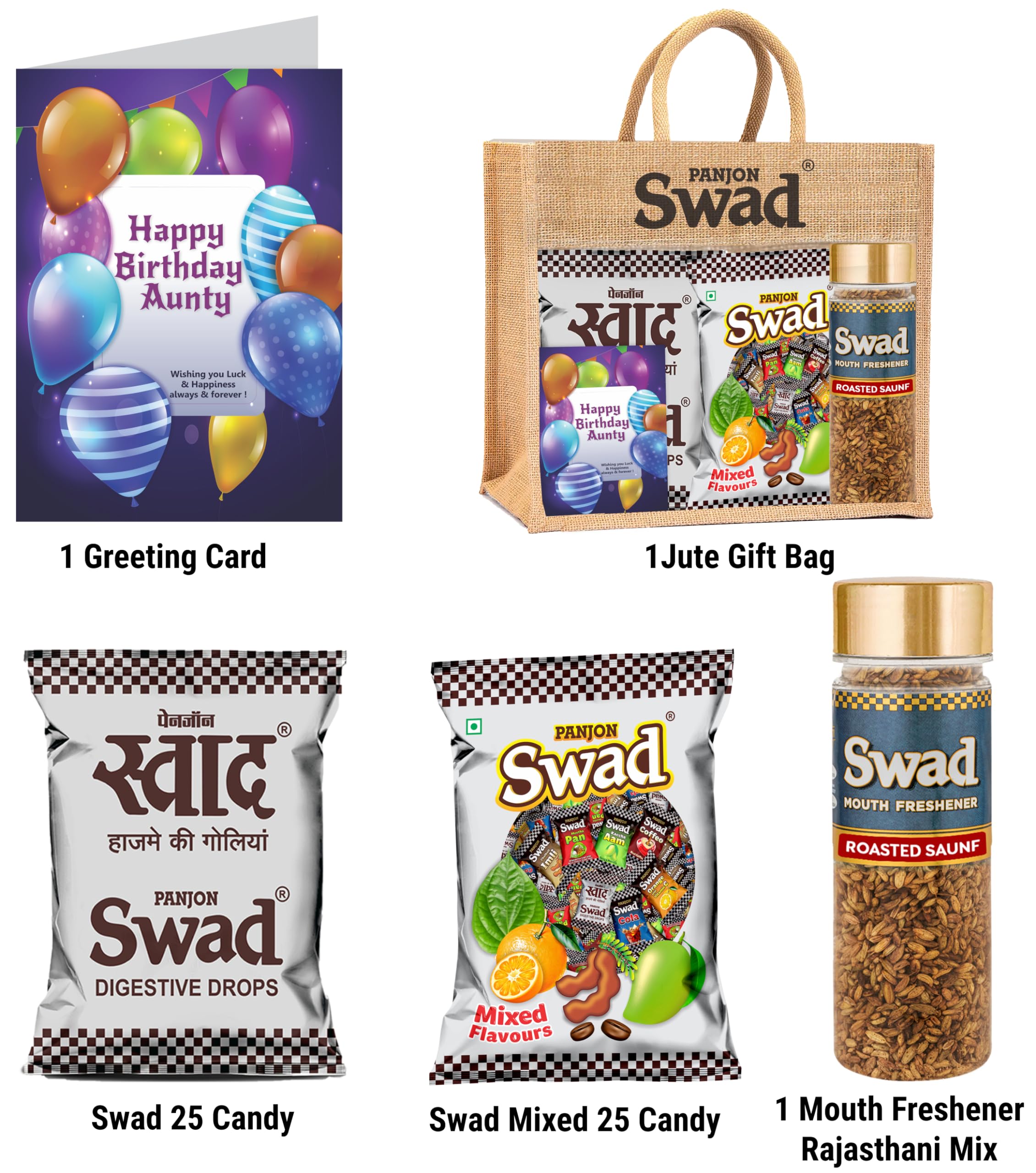 Swad Happy Birthday Aunty Gift with Card (25 Swad Candy 25 Mixed Toffee Roasted Saunf Mix Mukhwas) in Jute Bag Happy Birthday Aunty Gift with Card hamper gifts best unique for greeting message customised customized personalised personalized candy toffee fragrance scent perfumeSwad Trust Since 1986: India's favourite Digestive confectionery candy brand since 1986. A quality product by Panjon Limited.Swad Candy & Mukhwas Mouth fresheners range is made of ayurvedic herbal & digestive ingredients. Swad candy flavours: Kaccha Aam Meetha Pan Imli Cola Coffee & Orange with Vitamin C chocolates mix.Try all Swad Mouth fresheners: Mukhwas Paan Anardana Imli Khajoor Amla Aam Papad Saunf & Navratan Mix.