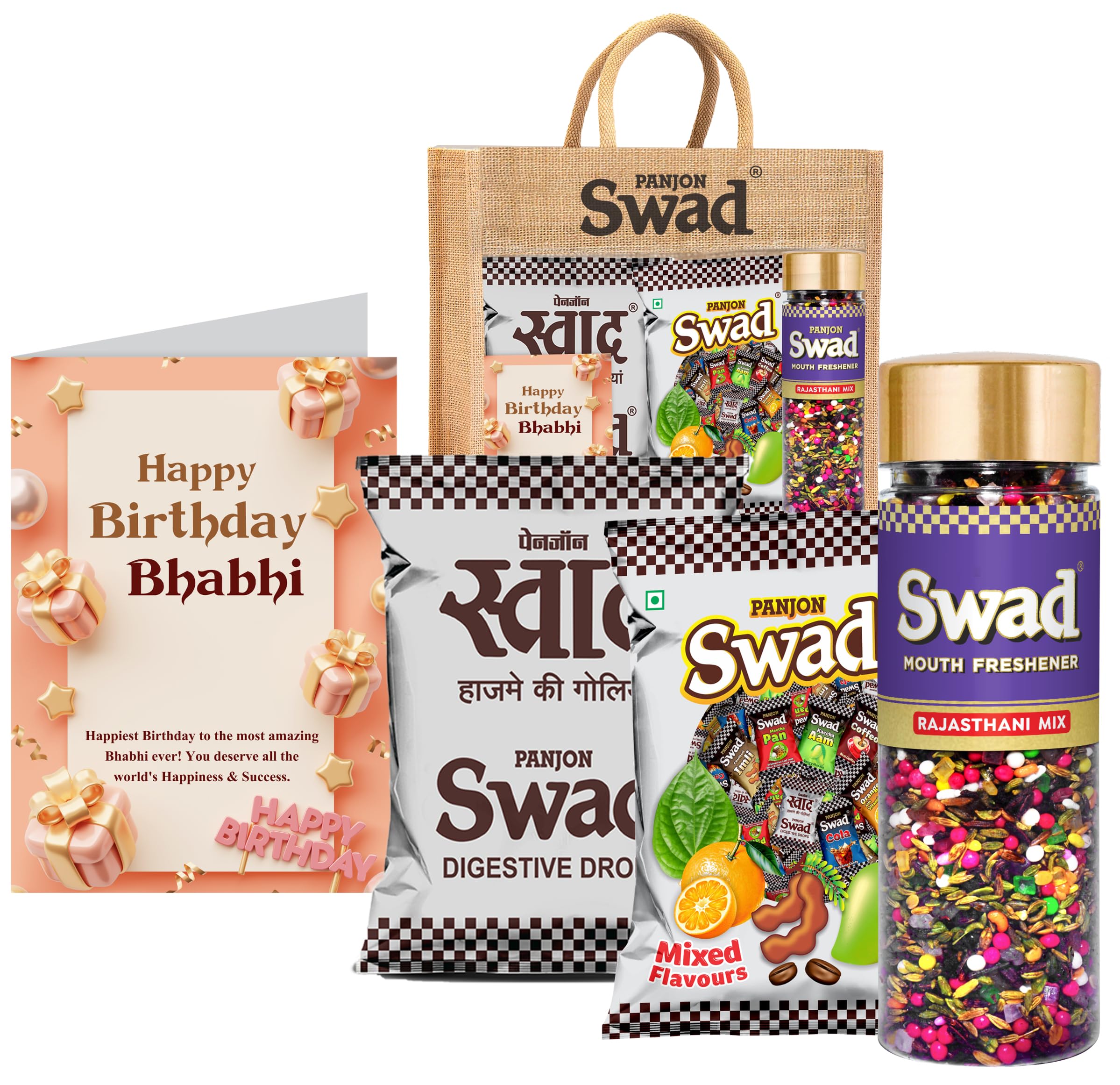 Swad Happy Birthday Bhabhi Gift with Card (25 Swad Candy 25 Mixed Toffee Rajasthani Mix Mukhwas) in Jute Bag Happy Birthday Bhabhi Gift with Card hamper gifts best unique for greeting message customised customized personalised personalized candy toffee fragrance scent perfumeSwad Trust Since 1986: India's favourite Digestive confectionery candy brand since 1986. A quality product by Panjon Limited.Swad Candy & Mukhwas Mouth fresheners range is made of ayurvedic herbal & digestive ingredients. Swad candy flavours: Kaccha Aam Meetha Pan Imli Cola Coffee & Orange with Vitamin C chocolates mix.Try all Swad Mouth fresheners: Mukhwas Paan Anardana Imli Khajoor Amla Aam Papad Saunf & Navratan Mix.