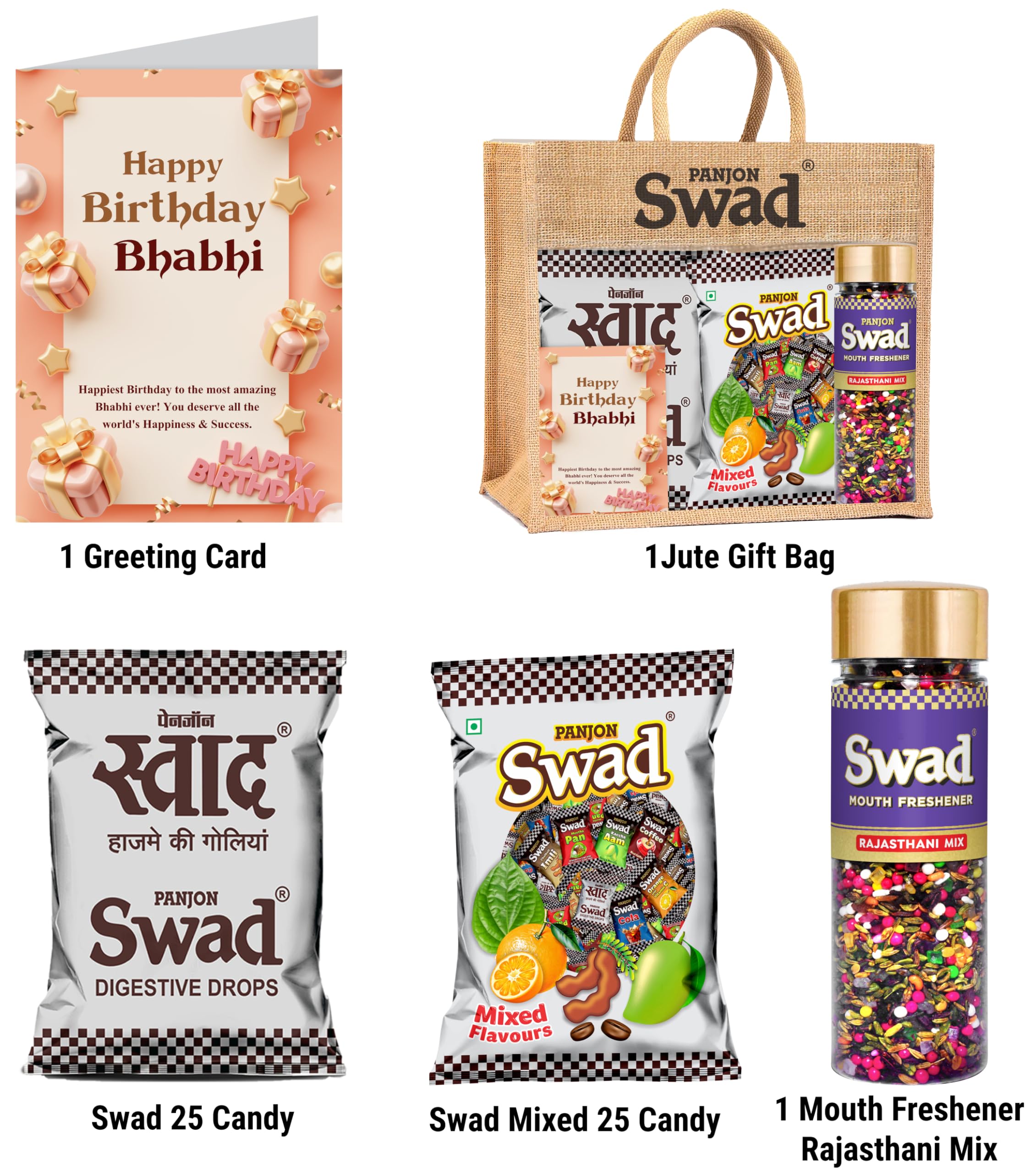 Swad Happy Birthday Bhabhi Gift with Card (25 Swad Candy 25 Mixed Toffee Rajasthani Mix Mukhwas) in Jute Bag