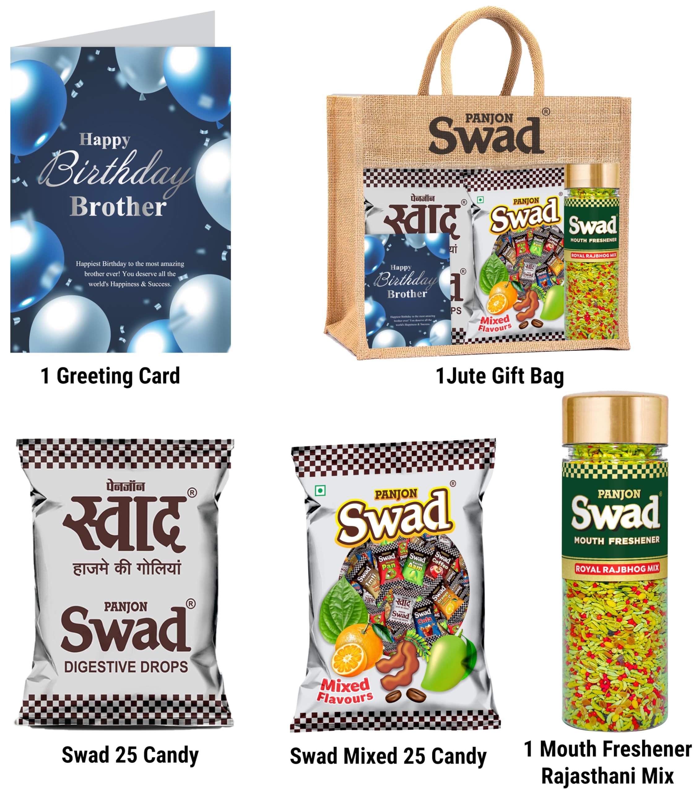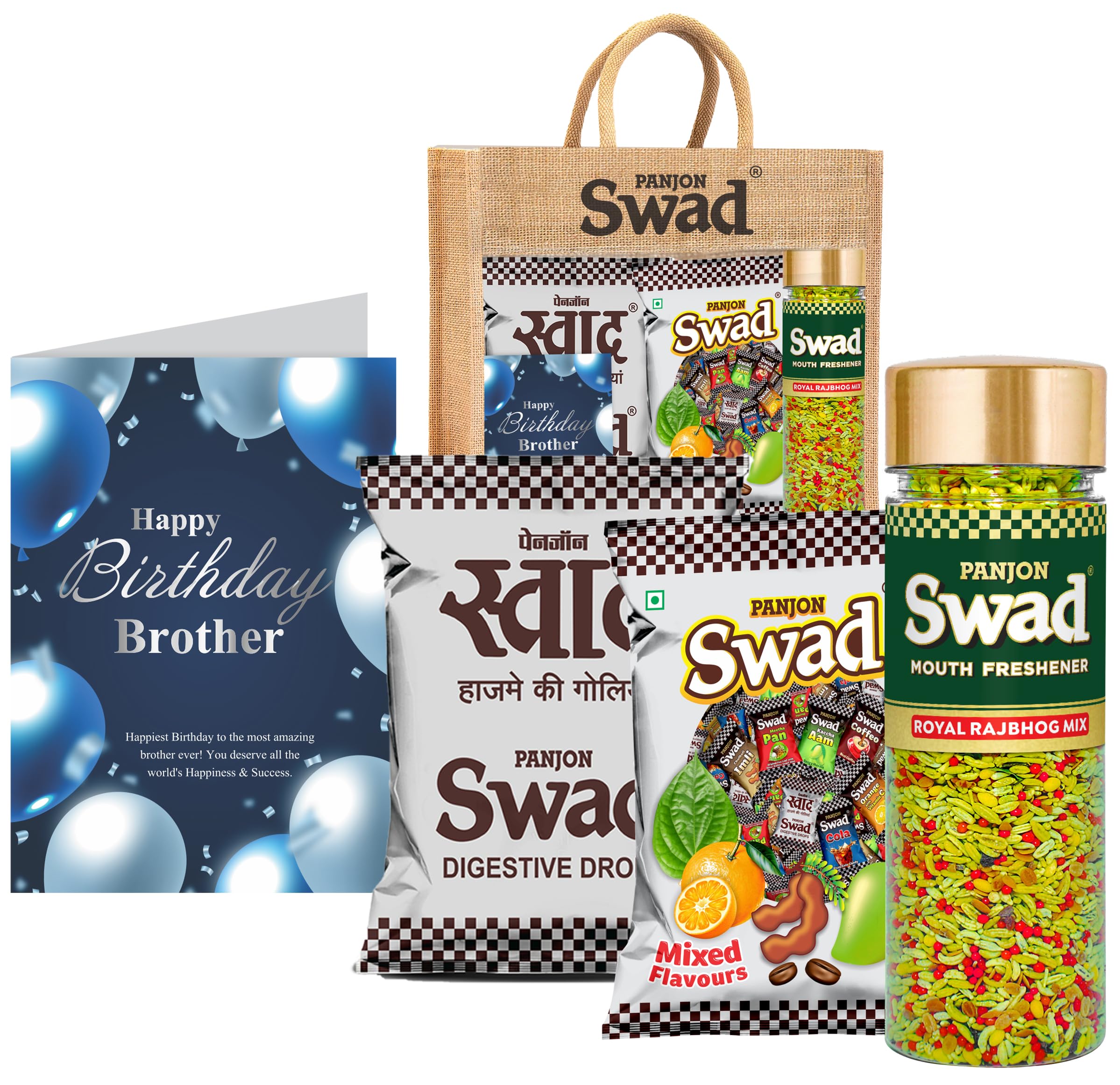 Swad Happy Birthday Brother Bhaiya Gift with Card (25 Swad Candy 25 Mixed Toffee Rajbhog Mix Mukhwas) in Jute Bag