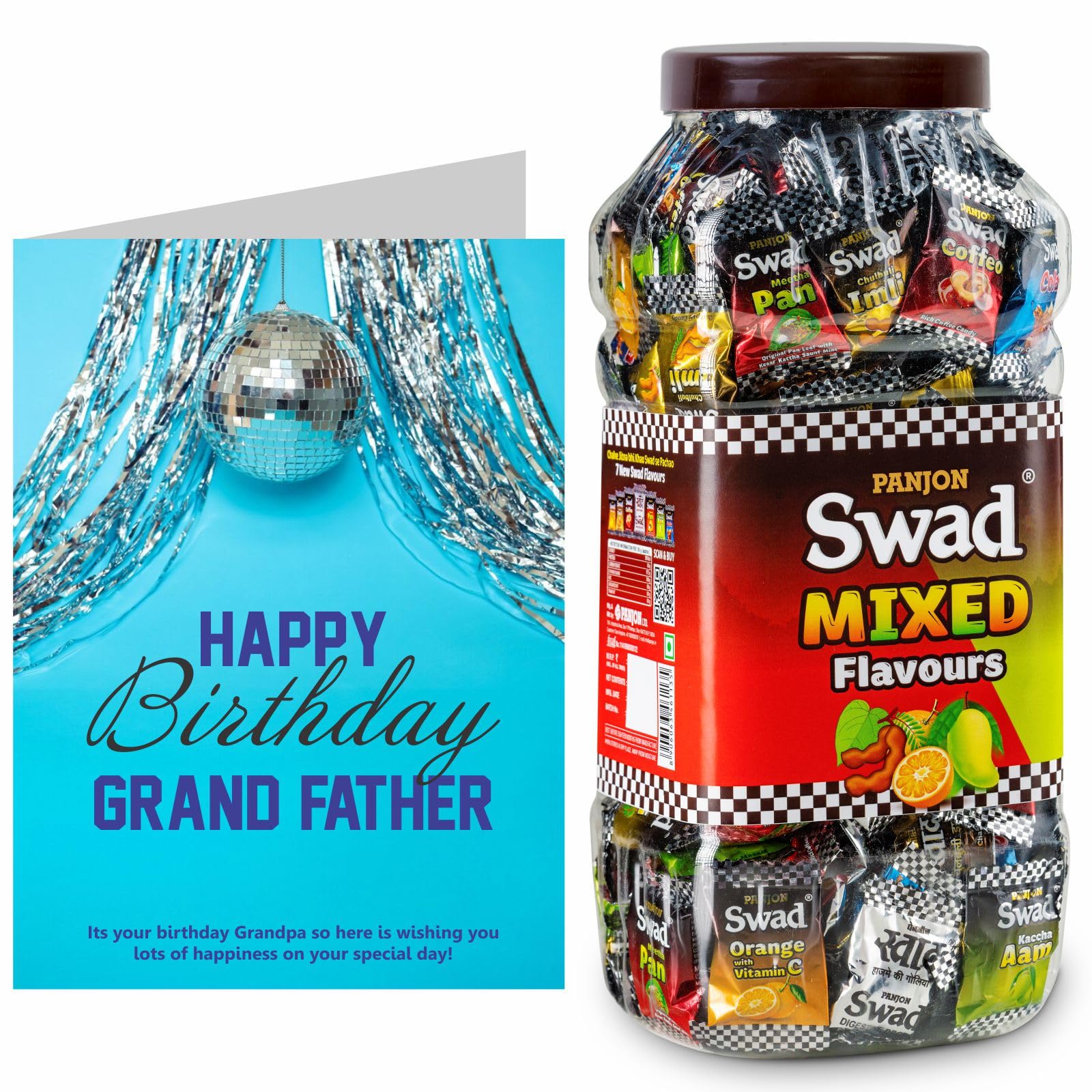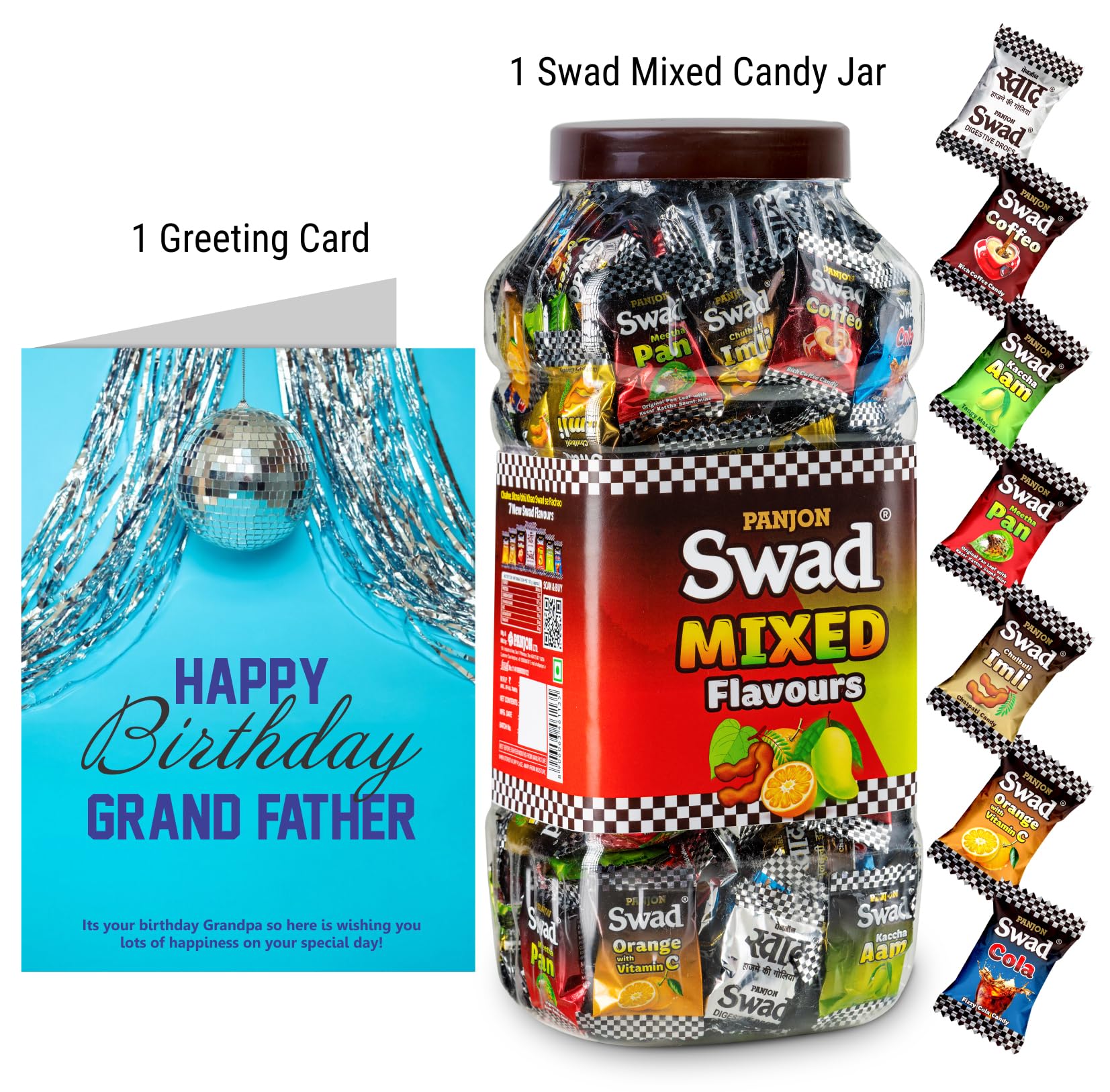 Swad Happy Birthday Dada Grand Dad Gift with Card (Swad Mixed Flavours Candy 150 Jar & 1 Greeting card) 2 units Happy Birthday Dada Grand Dad Gift with Card hamper gifts best unique for greeting message customised customized personalised personalized candy toffee candi chocolate hamper boxSwad Trust Since 1986: India's favourite Digestive confectionery candy brand since 1986. A quality product by Panjon Limited.Swad Mixed Candy Jar is made of assorter fruit chewy candy flavours: Kaccha Aam Meetha Pan Imli Cola Coffee & Orange with Vitamin C chocolates mix.Swad Candies helps in digestion & acidity. Its signature taste is relished by all age groups.Try all Swad Mouth fresheners: Mukhwas Paan Anardana Imli Khajoor Amla Aam Papad Saunf & Navratan Mix.