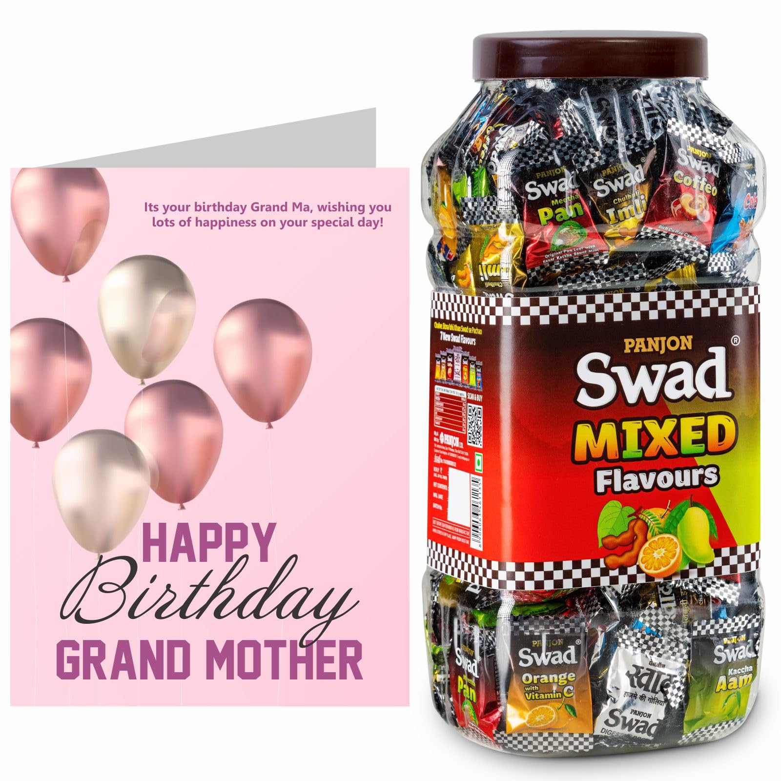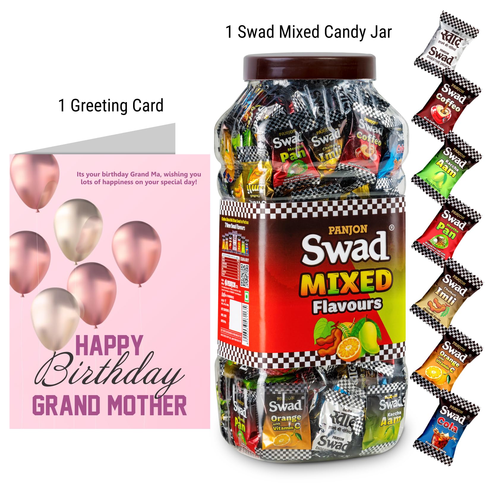 Swad Happy Birthday Dadi Grand Mom Gift with Card (Swad Mixed Flavours Candy 150 Jar & 1 Greeting card) 2 units Happy Birthday Dadi Grand Mom Gift with Card hamper gifts best unique for greeting message customised customized personalised personalized candy toffee candi chocolate hamper boxSwad Trust Since 1986: India's favourite Digestive confectionery candy brand since 1986. A quality product by Panjon Limited.Swad Mixed Candy Jar is made of assorter fruit chewy candy flavours: Kaccha Aam Meetha Pan Imli Cola Coffee & Orange with Vitamin C chocolates mix.Swad Candies helps in digestion & acidity. Its signature taste is relished by all age groups.Try all Swad Mouth fresheners: Mukhwas Paan Anardana Imli Khajoor Amla Aam Papad Saunf & Navratan Mix.