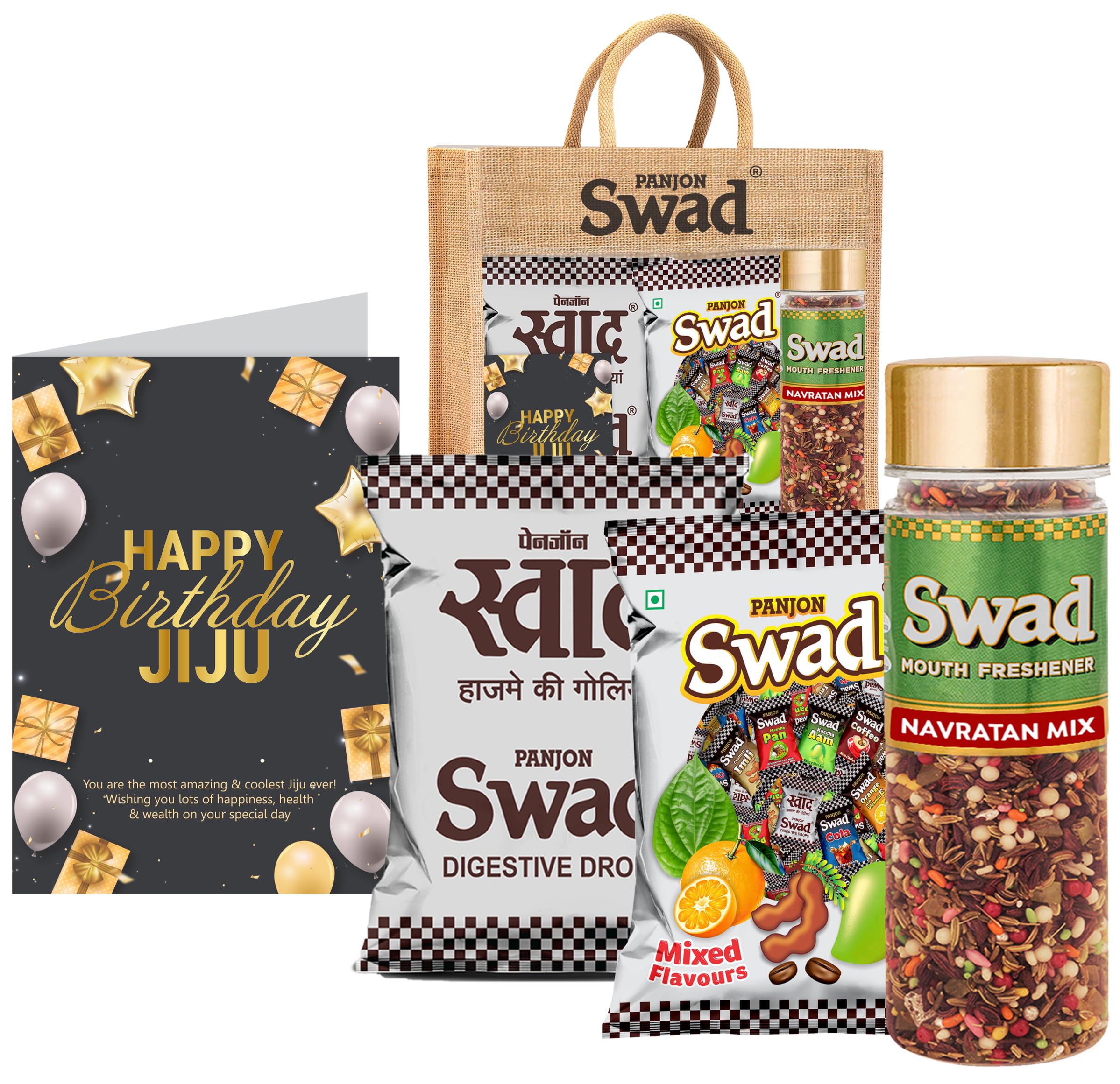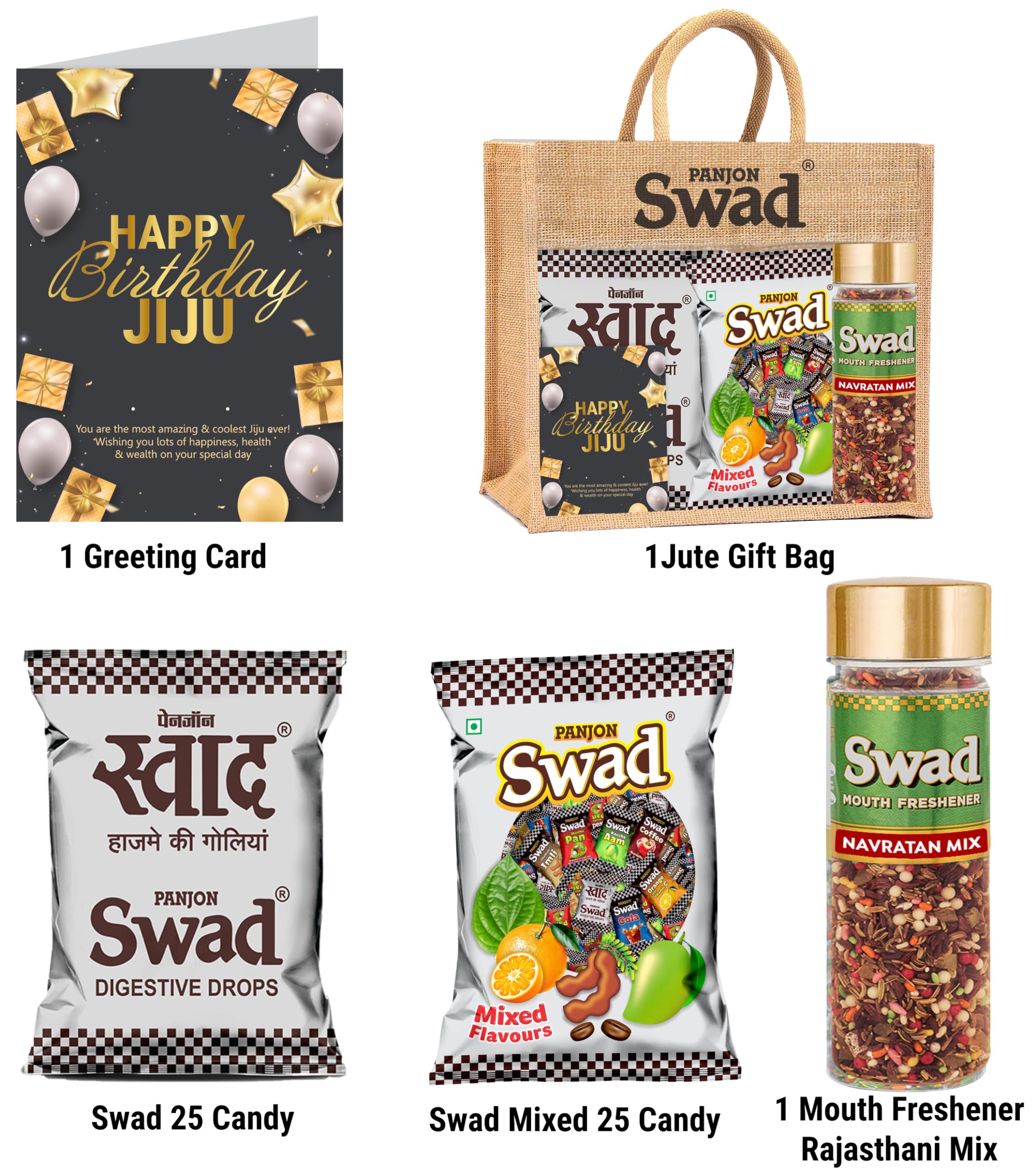 Swad Happy Birthday Best Jiju / Jija jijaji SISTER HUSBAND Gift with Card (25 Swad Candy 25 Mixed Toffee mix Mukhwas) in Jute Bag Happy Birthday Masi Mausi Gift with Card hamper gifts best unique for greeting message customised customized personalised personalized candy toffee fragrance scent perfumeSwad Trust Since 1986: India's favourite Digestive confectionery candy brand since 1986. A quality product by Panjon Limited.Swad Candy & Mukhwas Mouth fresheners range is made of ayurvedic herbal & digestive ingredients. Swad candy flavours: Kaccha Aam Meetha Pan Imli Cola Coffee & Orange with Vitamin C chocolates mix.Try all Swad Mouth fresheners: Mukhwas Paan Anardana Imli Khajoor Amla Aam Papad Saunf & Navratan Mix.