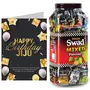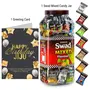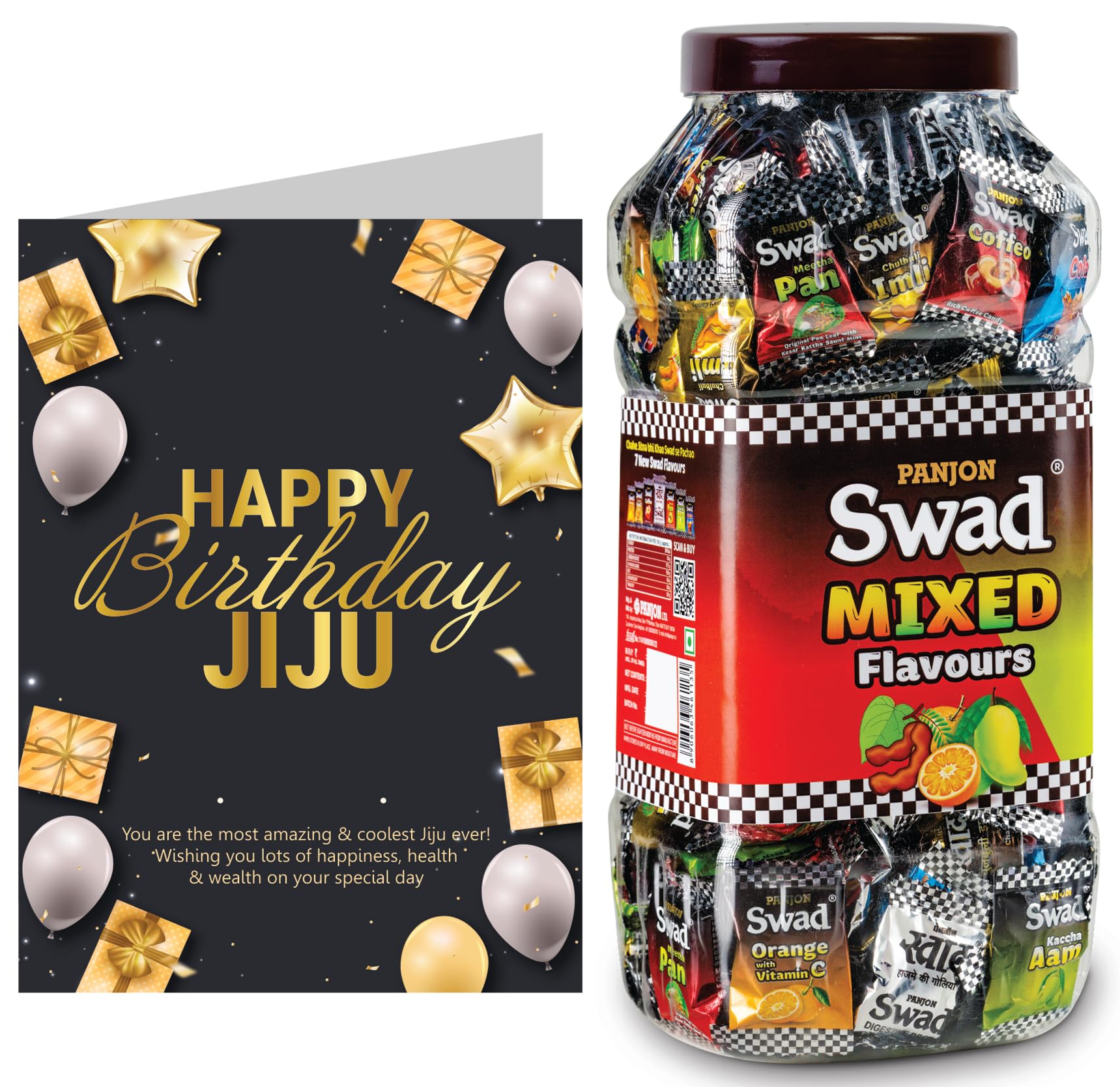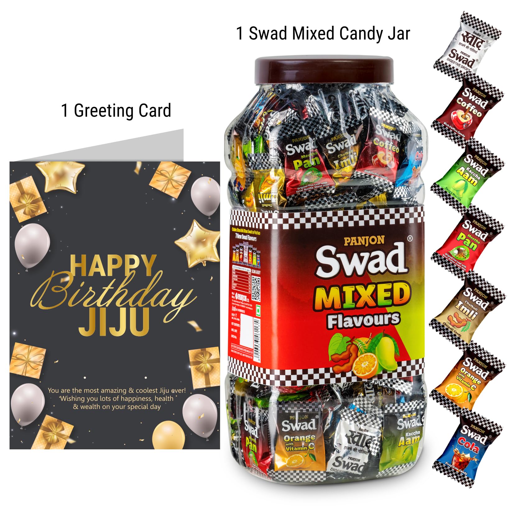 Swad Happy Birthday Gift for Gift for Best Jiju / Jija jijaji with Card (Swad Mixed Flavours Candy 150 Jar & 1 Greeting card) 2 units Happy Birthday jiju jijaji didi sister her husband Gift with Card hamper gifts best unique for greeting message customised customized personalised personalized candy toffee candi chocolate hamper box