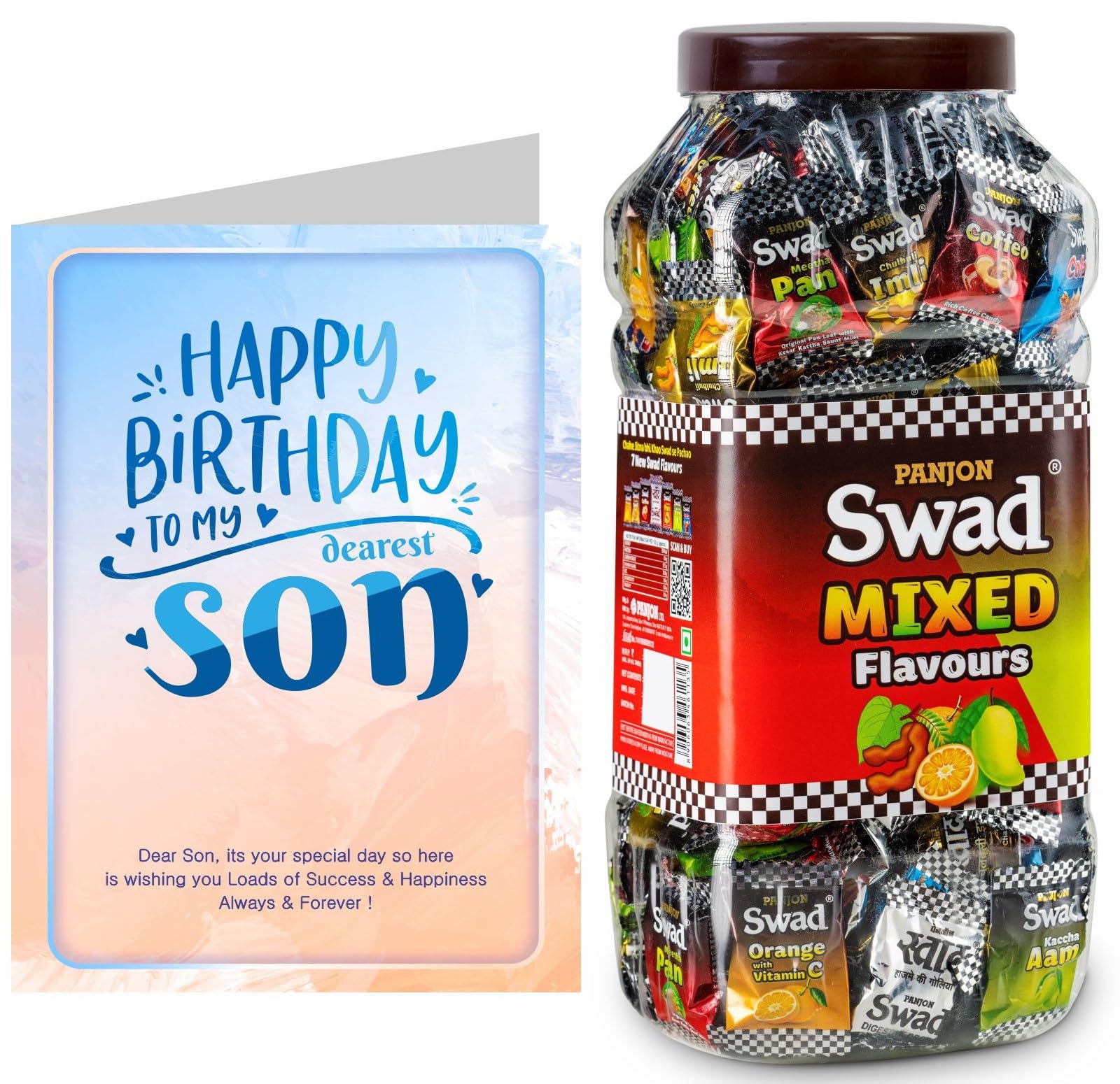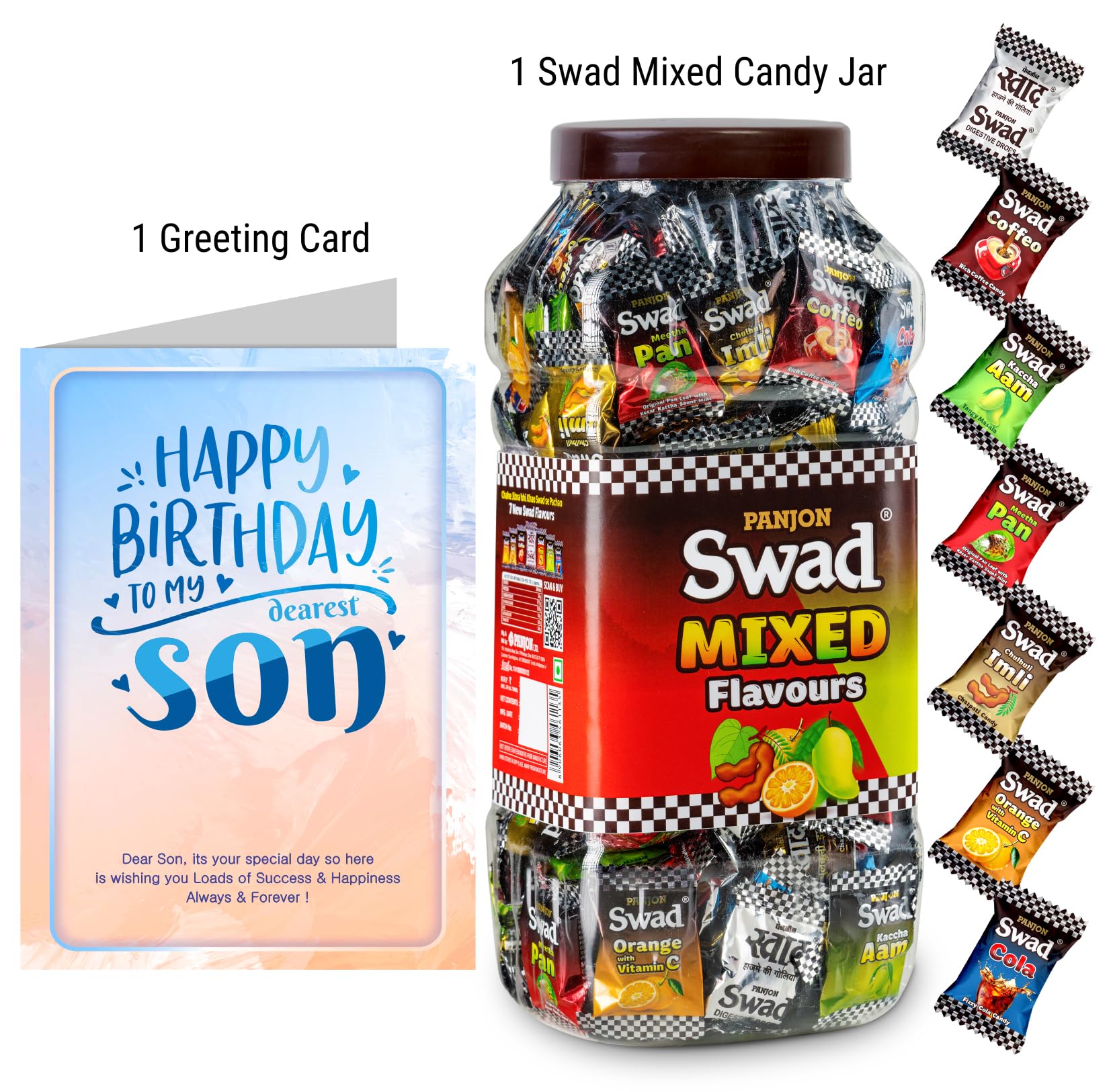 Swad Happy Birthday Gift for Son / Beta with Card (Swad Mixed Flavours Candy 150 Jar & 1 Greeting card) 2 units with Card hamper gifts best unique for greeting message customised customized personalised personalized candy toffee candi chocolate hamper Swad Trust Since 1986: India's favourite Digestive confectionery candy brand since 1986. A quality product by Panjon Limited.Swad Mixed Candy Jar is made of assorter fruit chewy candy flavours: Kaccha Aam Meetha Pan Imli Cola Coffee & Orange with Vitamin C chocolates mix.Swad Candies helps in digestion & acidity. Its signature taste is relished by all age groups.Try all Swad Mouth fresheners: Mukhwas Paan Anardana Imli Khajoor Amla Aam Papad Saunf & Navratan Mix. Happy Birthday son beta Gift with Card hamper gifts best unique for greeting message customised customized personalised personalized candy toffee candi chocolate hamper