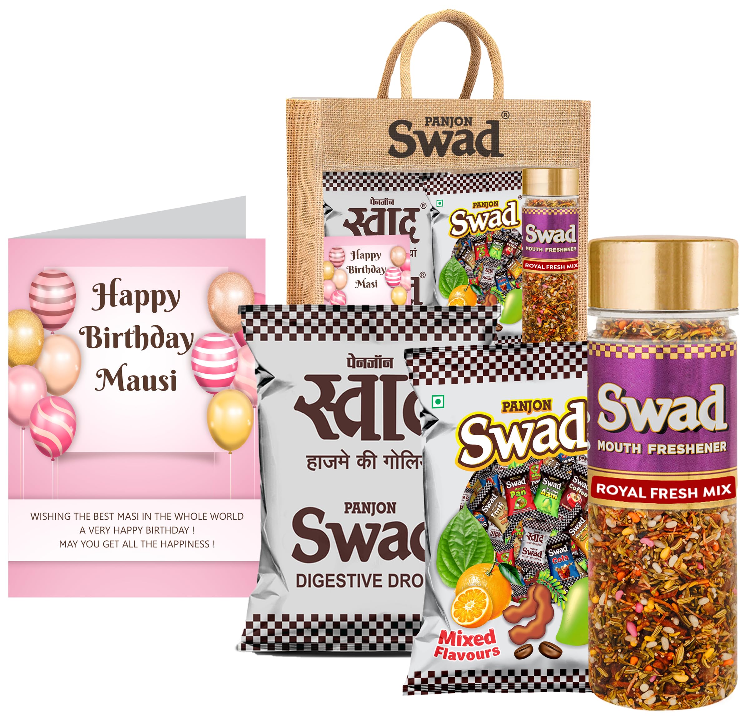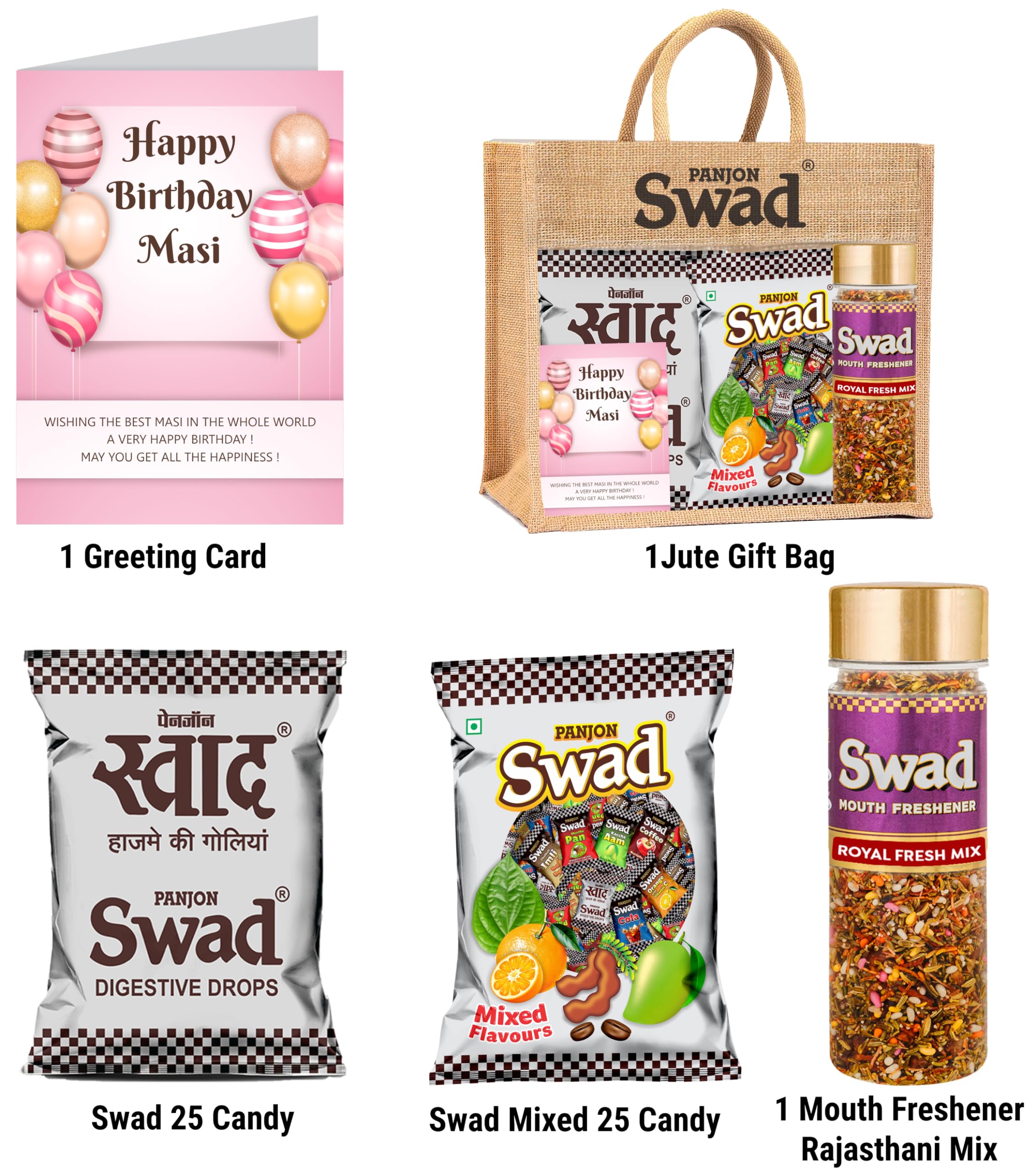 Swad Happy Birthday Masi / Mausi Gift with Card (25 Swad Candy 25 Mixed Toffee Royal Fresh Mix Mukhwas) in Jute Bag Happy Birthday Masi Mausi Gift with Card hamper gifts best unique for greeting message customised customized personalised personalized candy toffee fragrance scent perfumeSwad Trust Since 1986: India's favourite Digestive confectionery candy brand since 1986. A quality product by Panjon Limited.Swad Candy & Mukhwas Mouth fresheners range is made of ayurvedic herbal & digestive ingredients. Swad candy flavours: Kaccha Aam Meetha Pan Imli Cola Coffee & Orange with Vitamin C chocolates mix.Try all Swad Mouth fresheners: Mukhwas Paan Anardana Imli Khajoor Amla Aam Papad Saunf & Navratan Mix.