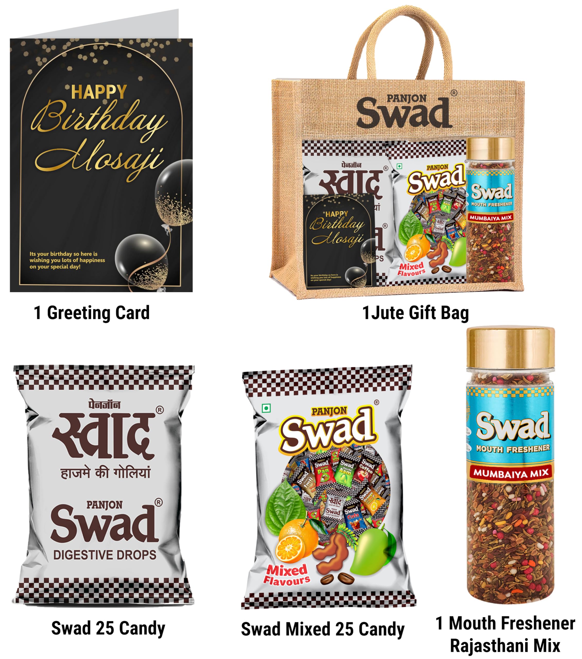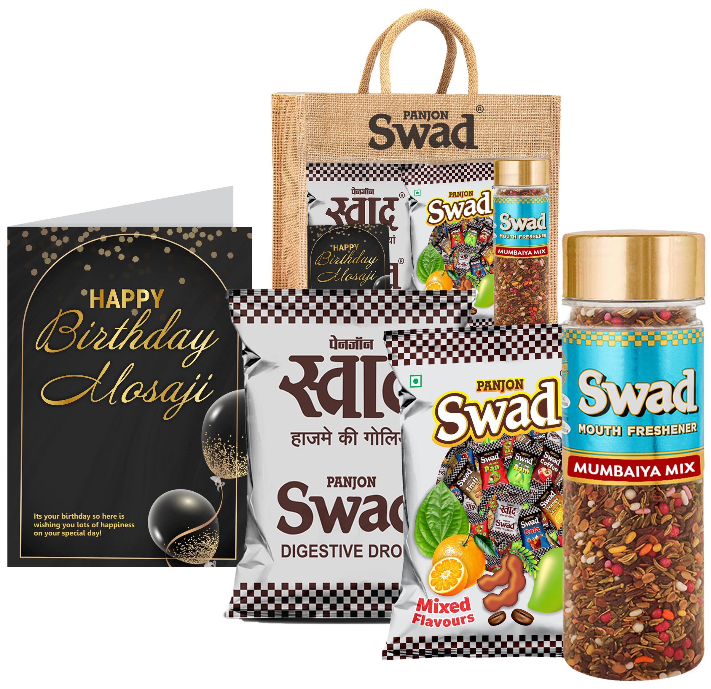 Swad Happy Birthday Mosaji / Masaji Gift with Card (25 Swad Candy 25 Mixed Toffee Mumbaiya Mix Mukhwas) in Jute Bag Happy Birthday Mosaji Masaji Gift with Card hamper gifts best unique for greeting message customised customized personalised personalized candy toffee fragrance scent perfumeSwad Trust Since 1986: India's favourite Digestive confectionery candy brand since 1986. A quality product by Panjon Limited.Swad Candy & Mukhwas Mouth fresheners range is made of ayurvedic herbal & digestive ingredients. Swad candy flavours: Kaccha Aam Meetha Pan Imli Cola Coffee & Orange with Vitamin C chocolates mix.Try all Swad Mouth fresheners: Mukhwas Paan Anardana Imli Khajoor Amla Aam Papad Saunf & Navratan Mix.