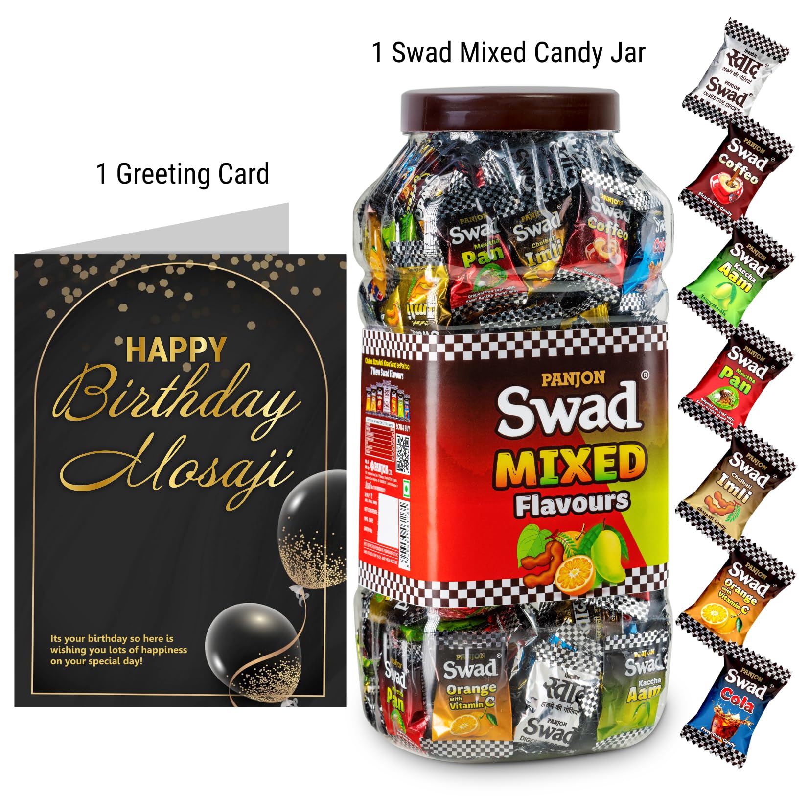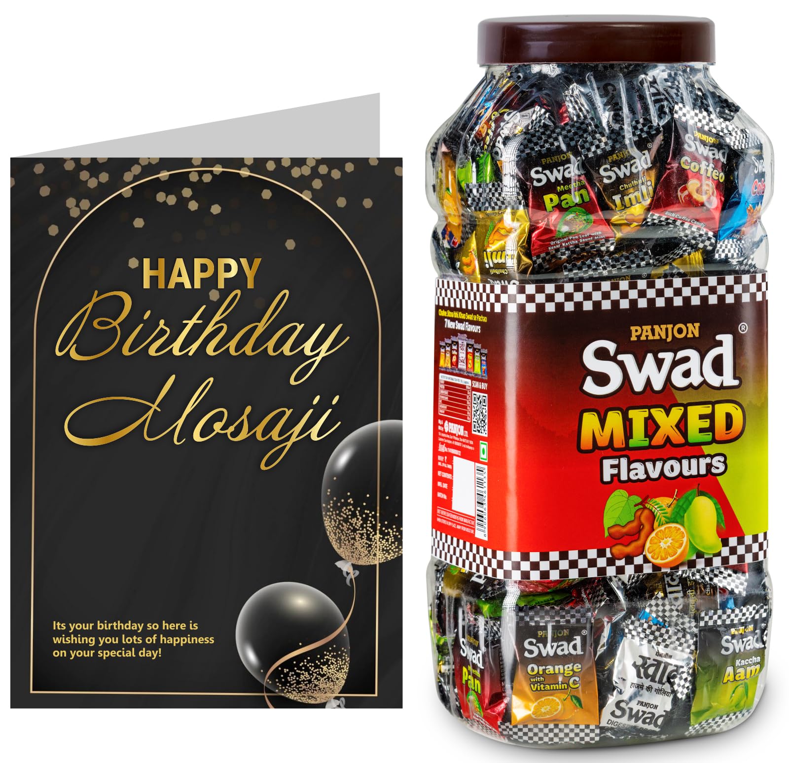 Swad Happy Birthday Mosaji / Masaji Gift with Card (Swad Mixed Flavours Candy 150 Jar & 1 Greeting card) 2 units Happy Birthday Mosaji Masaji Gift with Card hamper gifts best unique for greeting message customised customized personalised personalized candy toffee candi chocolate hamper boxSwad Trust Since 1986: India's favourite Digestive confectionery candy brand since 1986. A quality product by Panjon Limited.Swad Mixed Candy Jar is made of assorter fruit chewy candy flavours: Kaccha Aam Meetha Pan Imli Cola Coffee & Orange with Vitamin C chocolates mix.Swad Candies helps in digestion & acidity. Its signature taste is relished by all age groups.Try all Swad Mouth fresheners: Mukhwas Paan Anardana Imli Khajoor Amla Aam Papad Saunf & Navratan Mix.