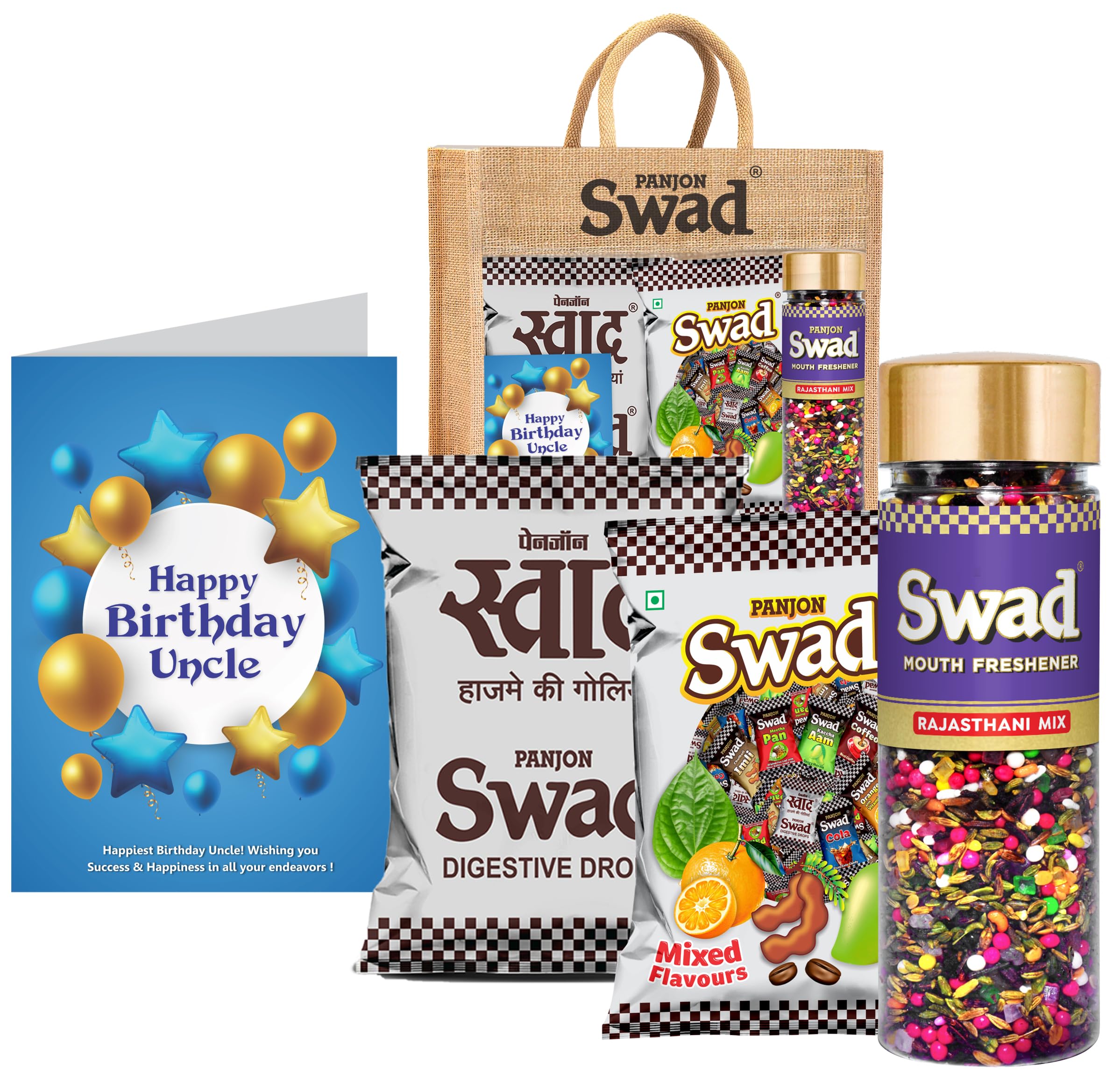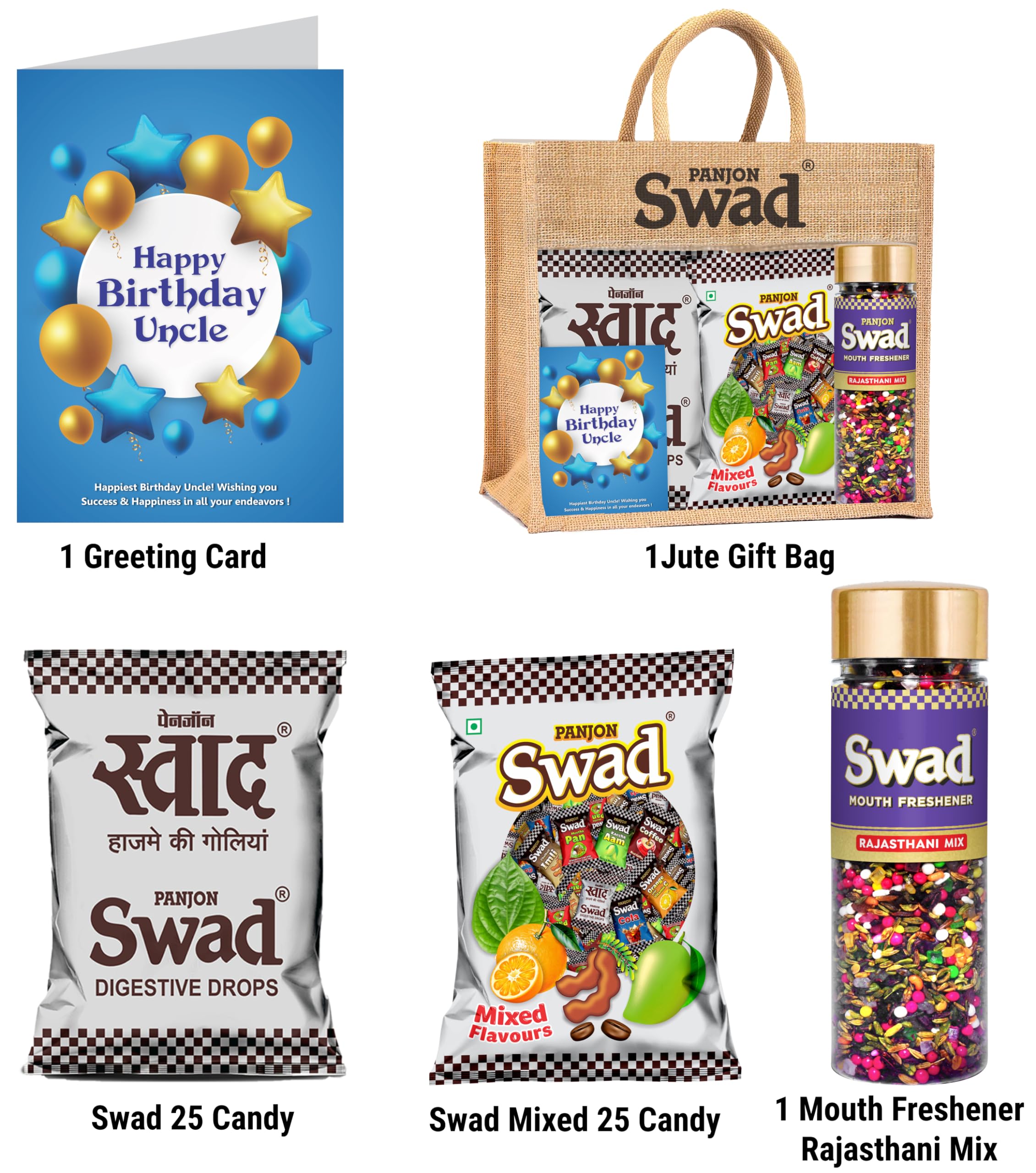 Swad Happy Birthday Uncle Gift with Card (25 Swad Candy 25 Mixed Toffee Rajasthani Mix Mukhwas) in Jute Bag Happy Birthday Uncle Gift with Card hamper gifts best unique for greeting message customised customized personalised personalized candy toffee candi chocolate hamper Swad Trust Since 1986: India's favourite Digestive confectionery candy brand since 1986. A quality product by Panjon Limited.Swad Candy & Mukhwas Mouth fresheners range is made of ayurvedic herbal & digestive ingredients. Swad candy flavours: Kaccha Aam Meetha Pan Imli Cola Coffee & Orange with Vitamin C chocolates mix.Try all Swad Mouth fresheners: Mukhwas Paan Anardana Imli Khajoor Amla Aam Papad Saunf & Navratan Mix.