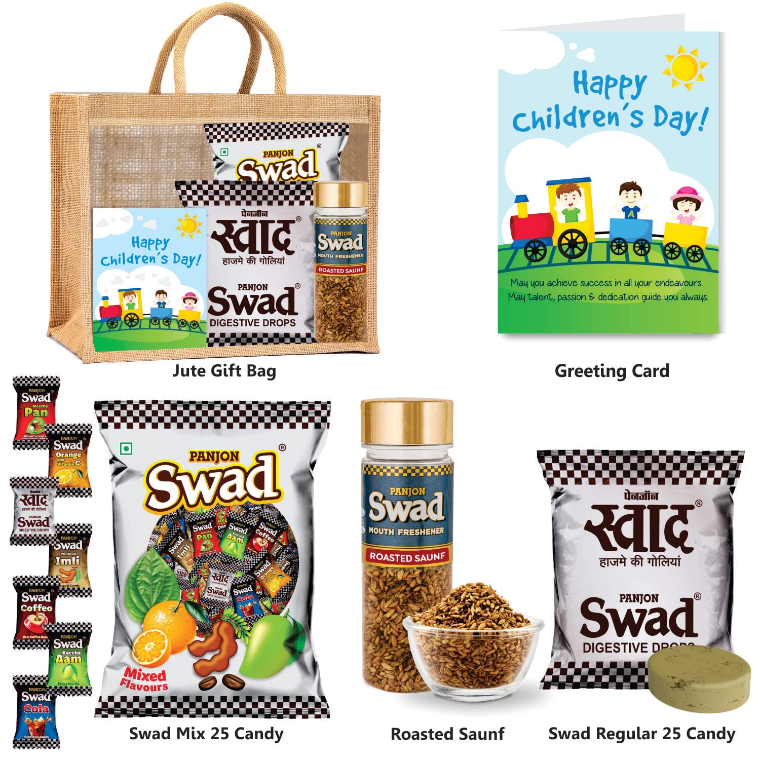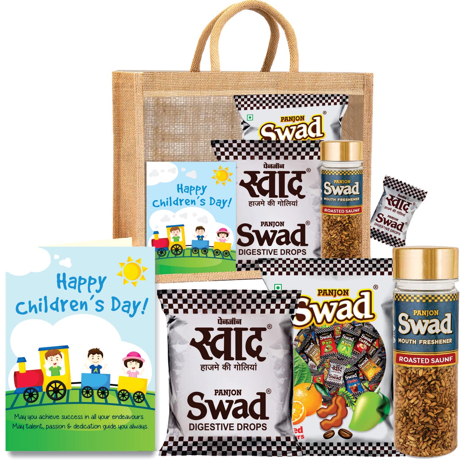 Swad Happy Children's Day Gift Hamper Set (Mixed Toffee & Digestive Candy & Rosted Saunf Pachak Mukhwas Mouthfreshener (25 Candy x 2) & 1 bottle) with Greeting Card & Jute BagGift Item