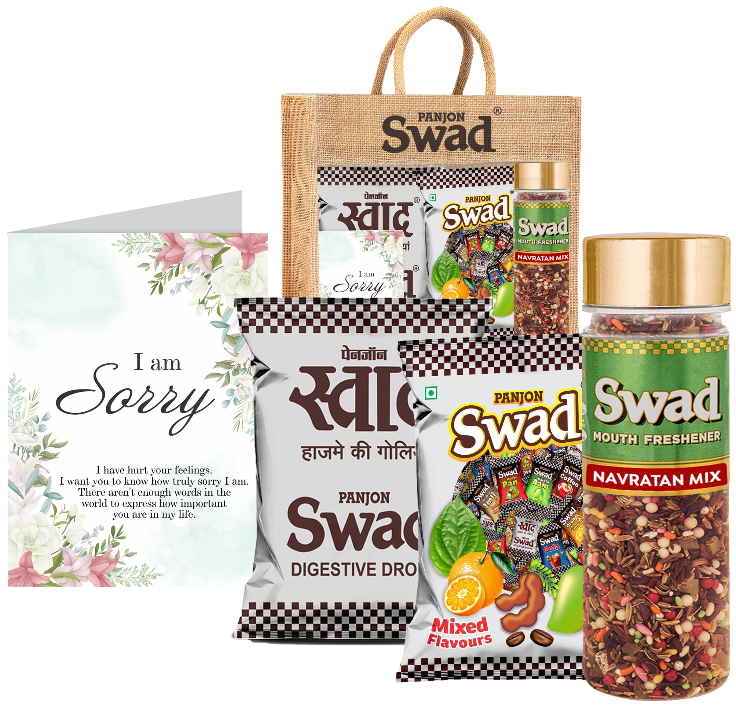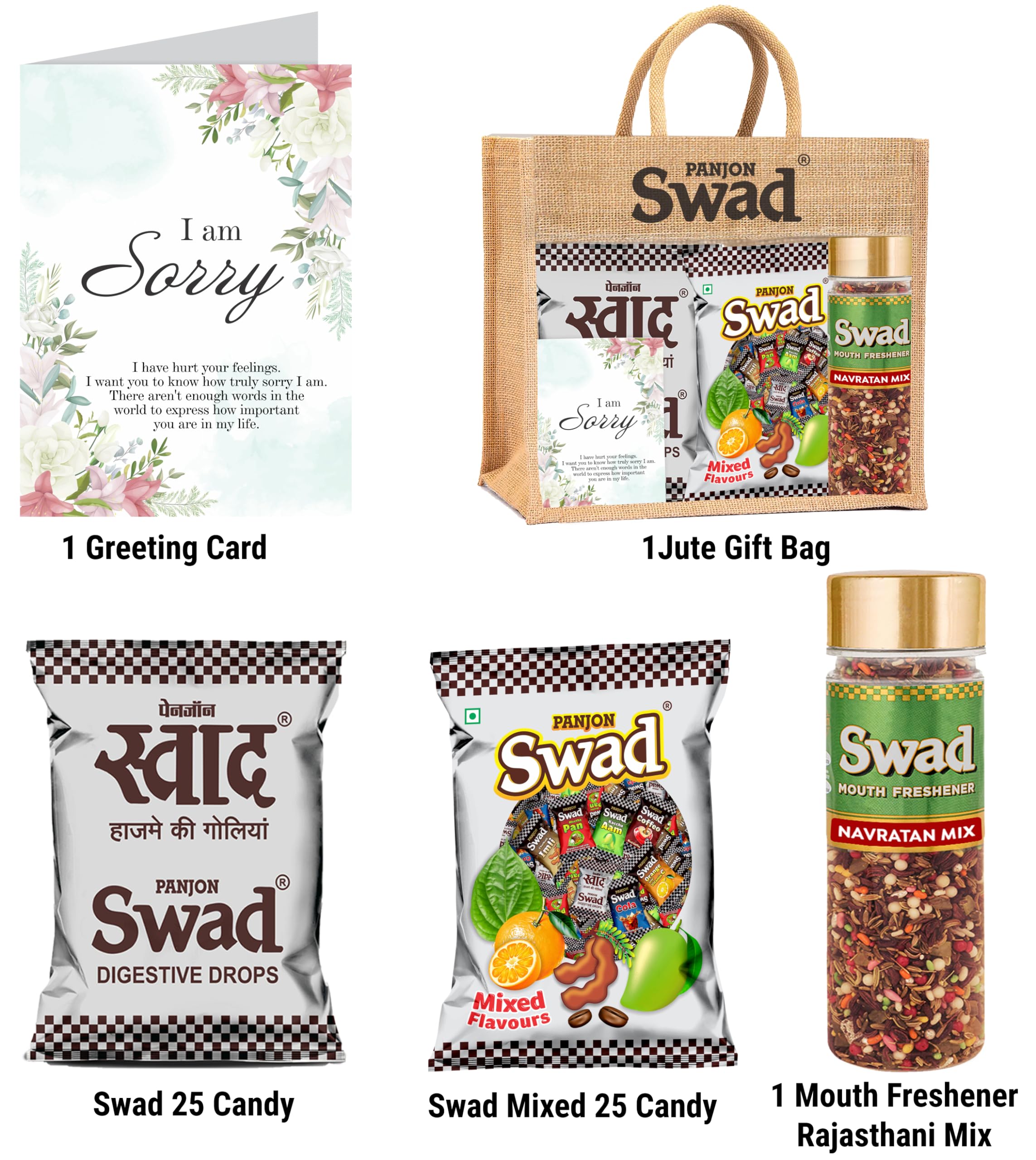 Swad I am Sorry Apology Gift with Card (25 Swad Candy 25 Mixed Toffee Navratan Mix Mukhwas) in Jute Bag I am Sorry Apology Gift with Card hamper gifts best unique for greeting message customised customized personalised personalized candy toffee fragrance scent perfumeSwad Trust Since 1986: India's favourite Digestive confectionery candy brand since 1986. A quality product by Panjon Limited.Swad Candy & Mukhwas Mouth fresheners range is made of ayurvedic herbal & digestive ingredients. Swad candy flavours: Kaccha Aam Meetha Pan Imli Cola Coffee & Orange with Vitamin C chocolates mix.Try all Swad Mouth fresheners: Mukhwas Paan Anardana Imli Khajoor Amla Aam Papad Saunf & Navratan Mix.