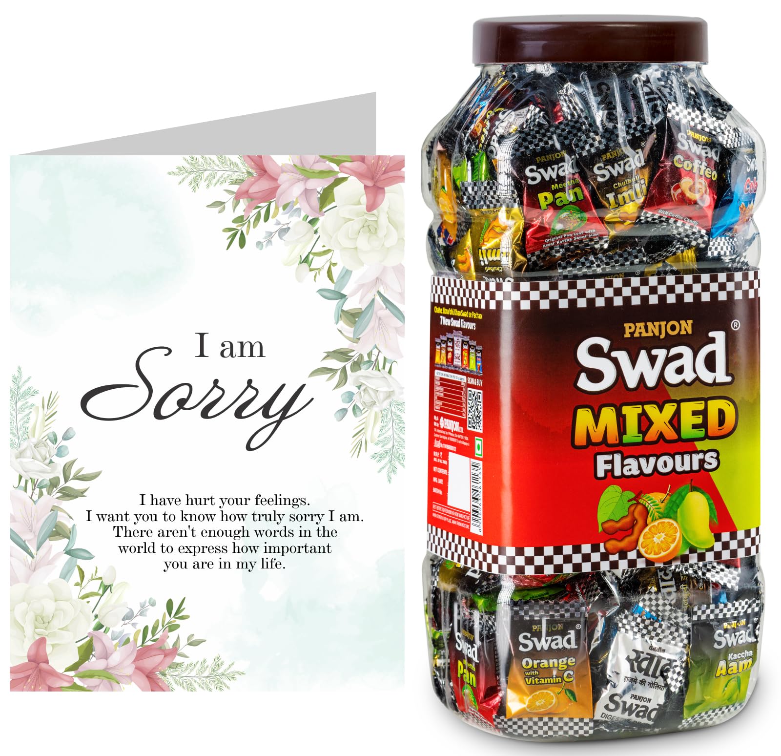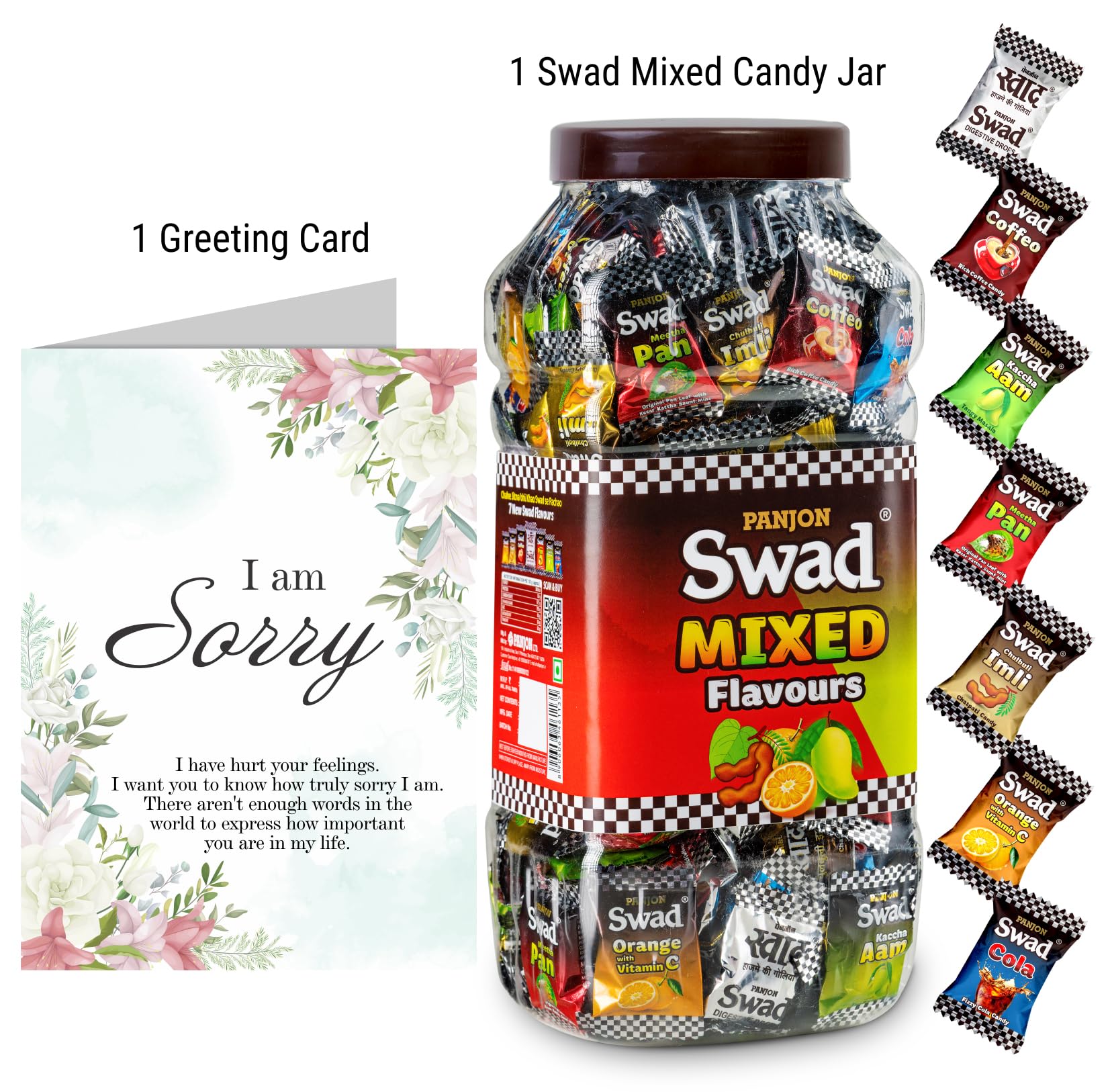 Swad I am Sorry Apology Gift with Card (Swad Mixed Flavours Candy 150 Jar & 1 Greeting card) 2 units I am Sorry Apology Gift with Card hamper gifts best unique for greeting message customised customized personalised personalized candy toffee candi chocolate hamper boxSwad Trust Since 1986: India's favourite Digestive confectionery candy brand since 1986. A quality product by Panjon Limited.Swad Mixed Candy Jar is made of assorter fruit chewy candy flavours: Kaccha Aam Meetha Pan Imli Cola Coffee & Orange with Vitamin C chocolates mix.Swad Candies helps in digestion & acidity. Its signature taste is relished by all age groups.Try all Swad Mouth fresheners: Mukhwas Paan Anardana Imli Khajoor Amla Aam Papad Saunf & Navratan Mix.